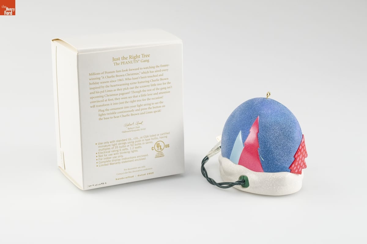 Just the Right Tree / The PEANUTS [R] Gang / Millions of Peanuts fans look forward to watching the Emmy- / winning "A Charlie Brown Christmas," which has aired every / holiday season since 1965. Who hasn't been touched and / inspired by the heartwarming scene featuring Charlie Brown / and his pal Linus as they pick out the scrawny little tree for the / upcoming Christmas pageant? Though the rest of the gang isn't / convinced at first, they soon see that a little love and attention / will transform it into the right tree for the occasion! / Plug the ornament into your light string to see the / lights twinkle continuously and press the button on / the base to hear Charlie Brown and Linus Speak! / Robert Chad / Hallmark Keepsake Artist / Use only with standard UL, cUL, or CSA listed or certified / miniature light strings using push-in type bulbs, having / multiples of 35 bulbs or 50 bulbs in series. / Electrical rating 6 volts, 1.2 watts. / Not for use with blinking lights. / For indoor use only. / Complete display instructions enclosed. / Limited Warranty statement enclosed. / c UL(R) US / LISTED / ELECTRIC / ORNAMENT / For decorative use only. / Concu a des fins decoratives seulement. / handcrafted - dated 2009