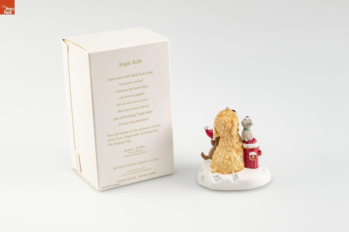 Jingle Bells / Bark, bark, bark! Bark, bark, bark! / Everyone's on key! / Celebrate the howl-idays / and join in yappily! / Arf, arf, arf! Arf, arf, arf-- / what fun to hear and see / pup pals barking "Jingle Bells" / in three-dog harmony! / Press the button on the ornament to hear / music from "Jingle Bells" performed by / The Singing Dogs. / Katrina Bricker / Hallmark Keepsake Artist / BATTERY-OPERATED. Batteries included. / For decorative use only. / Concu a des fins decoratives seulement. / handcrafted - dated 2009