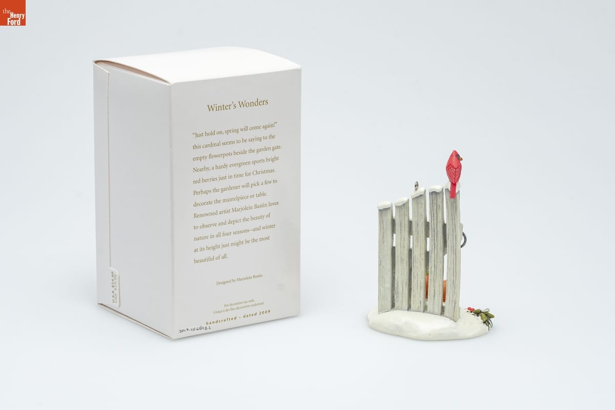 Winter's Wonders / "Just hold on, spring will come again!" / this cardinal seems to be saying to the / empty flowerpots beside the garden gate. / Nearby, a hardy evergreen sports bright / red berries just in time for Christmas. / Perhaps the gardener will pick a few to / decorate the mantelpiece or table. / Renowned artist Marjolein Bastin loves / to observe and depict the beauty of / nature in all four seasons--and winter / at its height just might be the most / beautiful of all! / Designed by Marjolein Bastin / For decorative use only. / Concu a des fins decoratives seulement. / handcrafted - dated 2009