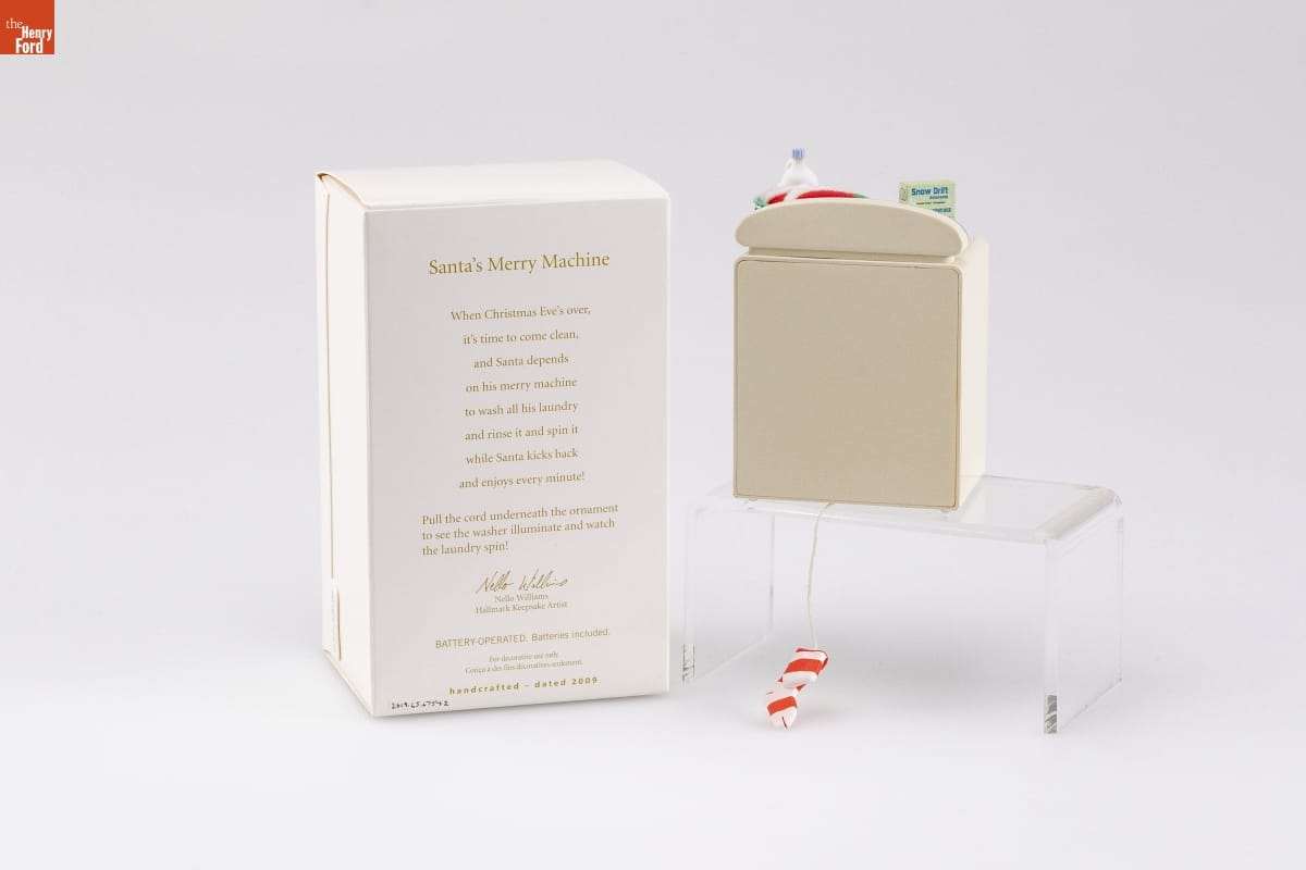 Santa's Merry Machine / When Christmas Eve's over, / it's time to come clean, / and Santa depends / on his merry machine / to wash all his laundry / and rinse it and spin it / while Santa kicks back / and enjoys every minute! / Pull the cord underneath the ornament / to see the washer illuminate and watch / the laundry spin! / Nello Williams / Hallmark Keepsake Artist / BATTERY-OPERATED. Batteries included. / For decorative use only. / Concu a des fins decoratives seulement. / handcrafted - dated 2009