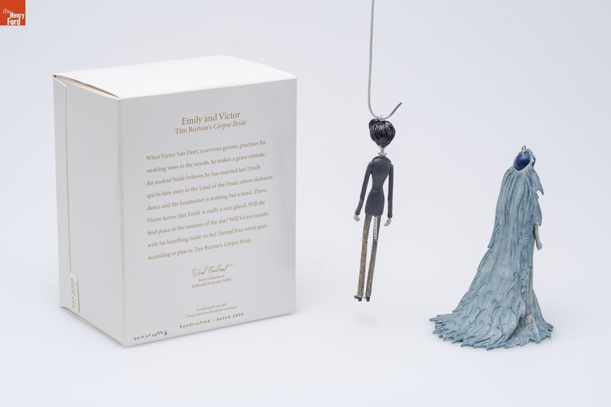 Emily and Victor / Tim Burton's Corpse Bride / When Victor Van Dort, a nervous groom, practices his / wedding vows in the woods, he makes a grave mistake. / An undead bride believes he has married her! Emily / spirits him away to the Land of the Dead, where skeletons / dance and the headwaiter is nothing but a head. There, / Victor learns that Emily is really a nice ghoul. Will she / find peace at the remains of the day? Will Victor reunite / with his breathing bride-to-be? Eternal love rarely goes / according to plan in Tim Burton's Corpse Bride. / Robert Hurlburt / Hallmark Keepsake Artist / For decorative use only. / Concu a des fins decoratives seulement. / handcrafted - dated 2009