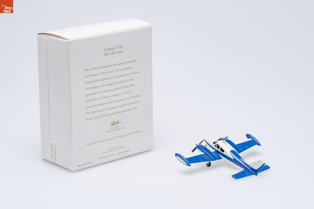 Cessna [R] 310 / Sky's the Limit / Since 1954, the distinctive styling and outstanding / performance of hte Cessna [R] 310 have made an / unforgettable impression on the aviation community. / Twin engines and wingtip fuel tanks give it the / appearance of a miniature airliner. Painted blue / and white, the military versions, L-27 and U-3, / were affectionately called "blue canoes" by their pilots. / The most famous 310, named Songbird, was featured / in the popular TV series Sky King in the late 1950s. / Lynn Norton / Hallmark Keepsake Artist / Thirteenth in the Series. Look for 13 on this ornament. / For decorative use only. / Concu a des fins decoratives seulement. / handcrafted - dated 2009
