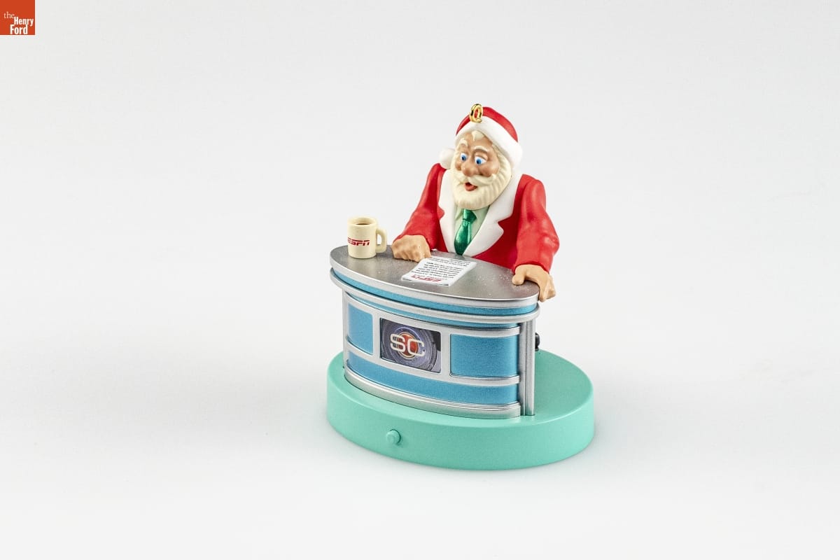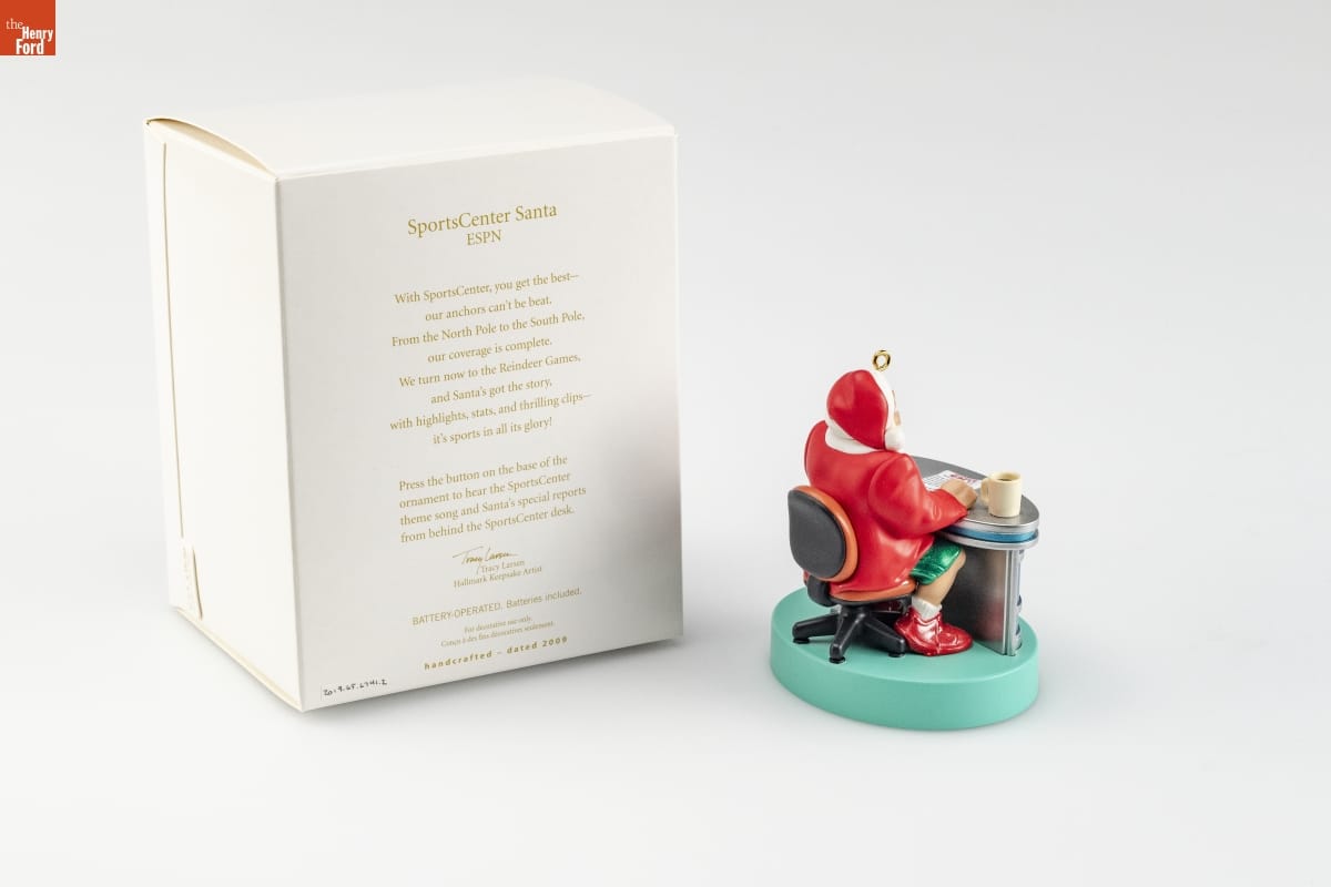 SportsCenter Santa / ESPN / With SportsCenter, you get the best-- / our anchors can't be beat. / From the North Pole to the South Pole, / our coverage is complete. / We turn now to the Reindeer Games, / and Santa's got the story, / with highlights, stats, and thrilling clips-- / it's sports in all its glory! / Press the button on the base of the / ornament to hear the SportsCenter / theme song and Santa's special reports / from behind the SportsCenter desk. / Tracy Larsen / Hallmark Keepsake Artist / BATTERY-OPERATED. Batteries included. / For decorative use only. / Concu a des fins decoratives seulement. / handcrafted - dated 2009