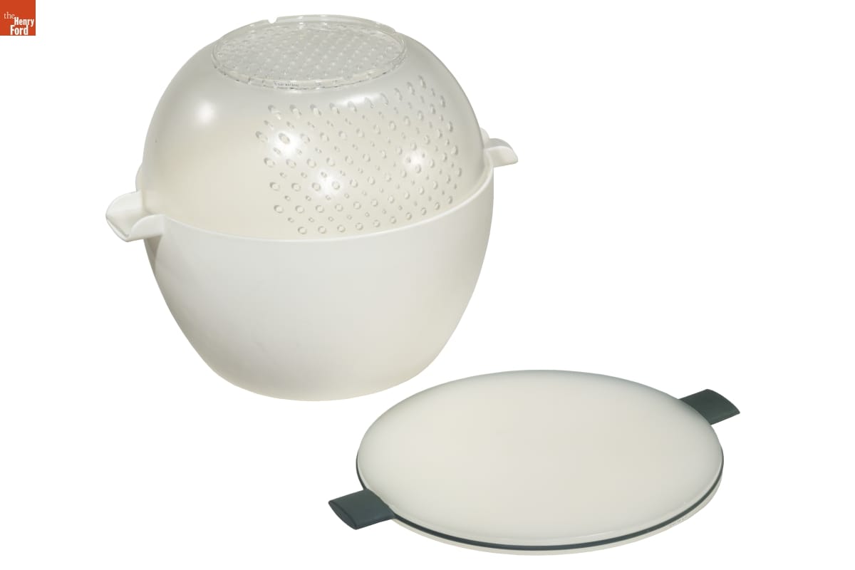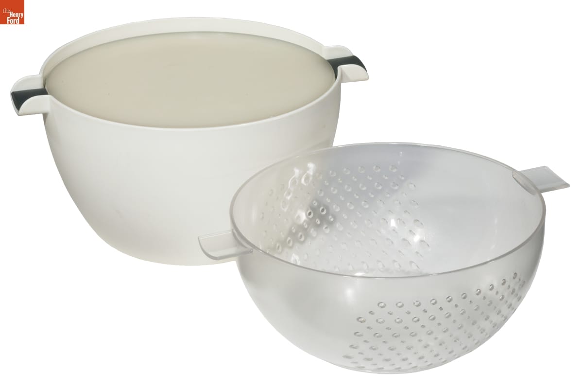 2 sided cutting board doubles as lid for storage and transport / Plastic colander nests in bowl or flips over to shake and drain / 4 1/2 quart bowl with handles that function as spouts / PReP.E / PREP SET / Durable for serving and practical for storing / Dishwasher safe / DANSK(R) / GRAVES STUDIO(TM)