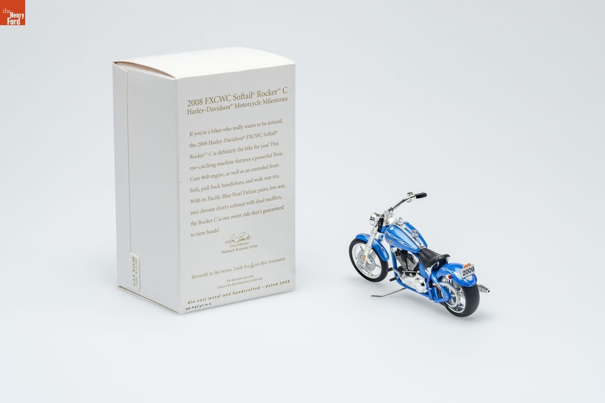 2008 FXCWC Softail [R] Rocker [TM] C / Harley-Davidson [R] Motorcycle Milestones / If you're a biker who really wants to be noticed, / the 2008 Harley-Davidson [R] FXCWC Softail [R] / Rocker [TM] C is definitely the bike for you! This / eye-catching machine features a powerful Twin / Cam 96B engine, as well as an extended front / fork, pull-back handlebars, and wide rear tire. / With its Pacific Blue Pearl Deluxe paint, low seat, / and chrome shorty exhaust with dual mufflers, / the Rocker C is one sweet ride that's guaranteed / to turn heads! / Don Palmiter / Hallmark Keepsake Artist / Eleventh in the Series. Look for 11 on this ornament. / For decorative use only. / Concu a des fins decoratives seulement. / die-cast metal and handcrafted - dated 2009