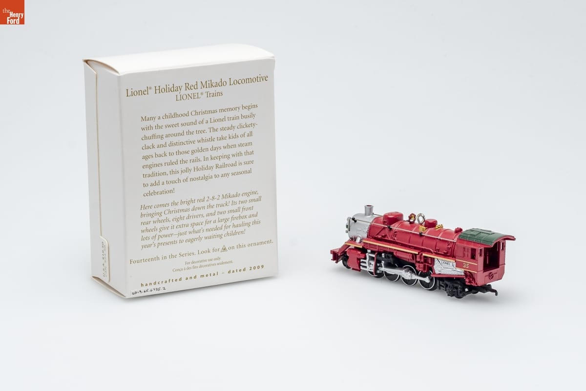 Lionel [R] Holiday Red Mikado Locomotive / LIONEL [R] Trains / Many a childhood Christmas memory begins / with the sweet sound of a Lionel train busily / chuffing around the tree. The steady clickety- / clack and distinctive whistle take kids of all / ages back to those golden days when steam / engines ruled the rails. In keeping with that / tradition, this jolly Holiday Railroad is sure / to add a touch of nostalgia to any seasonal / celebration! / Here comes the bright red 2-8-2 Mikado engine, / bringing Christmas down the track! Its two small / rear wheels, eight drivers, and two small front / wheels give it extra space for a large firebox and / tons of power--just what's needed for hauling this / year's presents to eagerly awaiting children! / Fourteenth in the Series. Look for 14 on this ornament. / For decorative use only. / Concu a des fins decoratives seulement. / handcrafted and metal - dated 2009