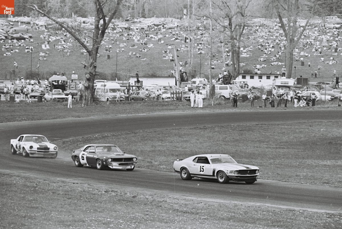 Ford Mustang, AMC Javelin, and Chevrolet Camaro in the Lime Rock Trans-Am Race, May 1970