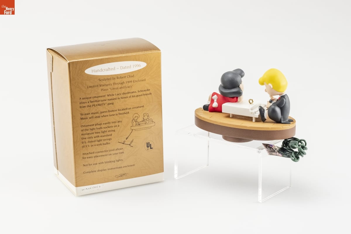 Handcrafted - Dated 1996 / Sculpted by Robert Chad / Limited Warranty Through 1999 Enclosed / Plays "Linus and Lucy" / A unique ornament! While Lucy daydreams, Schroeder / plays a familiar tune named in honor of his good friends / from the PEANUTS [R] gang. / To start music, press button located on ornament. / Music will stop when tune is finished. / Ornament plugs easily into any / of the light bulb sockets on a / miniature tree light string. / Use only with standard / U.L.- listed light strings / of 3.5- or 6- volt bulbs. / Attached connector cord allows / for easy placement on your tree. / Not for use with blinking lights. / Complete display instructions enclosed.