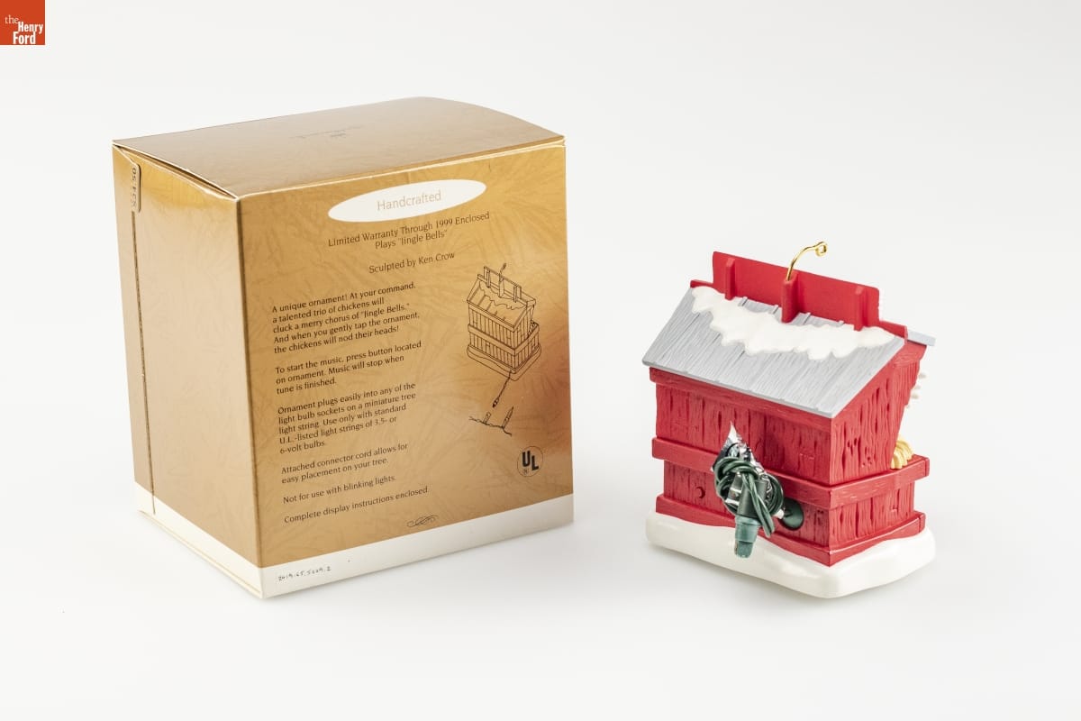 Handcrafted / Limited Warranty Through 1999 Enclosed / Plays "Jingle Bells" / Sculpted by Ken Crow / A unique ornament! At your command, / a talented trio of chickens will / cluck a merry chorus of "Jingle Bells." / And when you gently tap the ornament, / the chickens will nod their heads! / To start the music, press button located / on ornament. Music will stop when tune is finished. / Ornament plugs easily into any of the / light bulb sockets on a miniature tree / light string. Use only with standard / U.L.- listed light strings of 3.5- or / 6- volt bulbs. / Attached connector cord allows for / easy placement on your tree. / Not for use with blinking lights. / Complete display instructions enclosed.