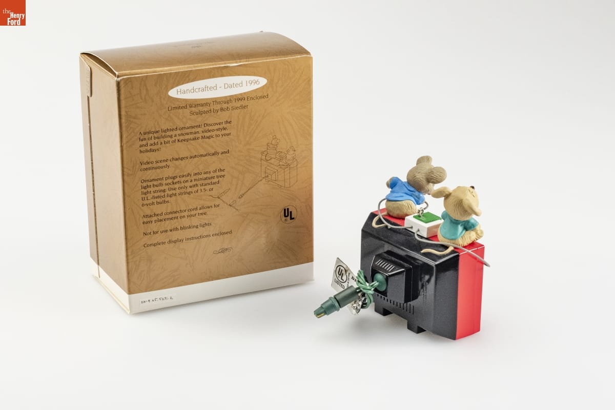 Handcrafted - Dated 1996 / Limited Warranty Through 1999 Enclosed / Sculpted by Bob Siedler / A unique lighted ornament! Discover the / fun of building a snowman, video-style, / and add a bit of Keepsake Magic to your / holidays! / Video scene changes automatically and / continuously. / Ornament plugs easily into any of the / light bulb sockets on a miniature tree / light string. Use only with standard / U.L.- listed light strings of 3.5- or / 6- volt bulbs. / Attached connector cord allows for / easy placement on your tree. / Not for use with blinking lights. / Complete display instructions enclosed.