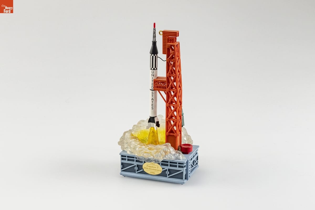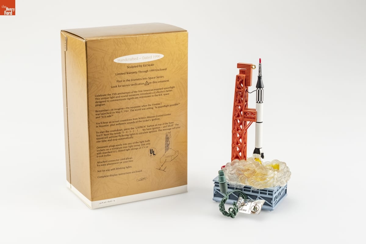 Handcrafted - Dated 1996 / Sculpted by Ed Seale / Limited Warranty Through 1999 Enclosed / First in the Journeys Into Space Series. / Look for series verification 1 on this ornament. / Celebrate the 35th anniversary of the first American-manned spaceflight. / This unique light-and-sound ornament introduces a Collector's Series / designed to commemorate significant milestones in the U.S.space / program. / Remember -- or imagine -- the suspense when the Freedom 7 / was launched on May 5, 1961. The world was asking: "Is spaceflight possible?" / and "Is it safe?" / You'll hear an actual countdown from NASA's Mission Control Center / in Houston, plus authentic sounds of the rocket's ignition. / To start the countdown, press the "LAUNCH" button on top of the base. / You'll hear the words "5 - 4 - 3 - 2 - 1 ... We have ignition -- and liftoff!" The / sound will activate flickeing lights to simulate ignition. The message will play / one time and stop automatically. / Ornament plugs easily into any of the light bulb / sockets on a miniature tree light string. Use only / with standard U.L.- listed light strings of 3.5- or / 6- volt bulbs. / Attached connector cord allows / for easy placement on your tree. / Not for use with blinking lights. / Complete display instructions enclosed.