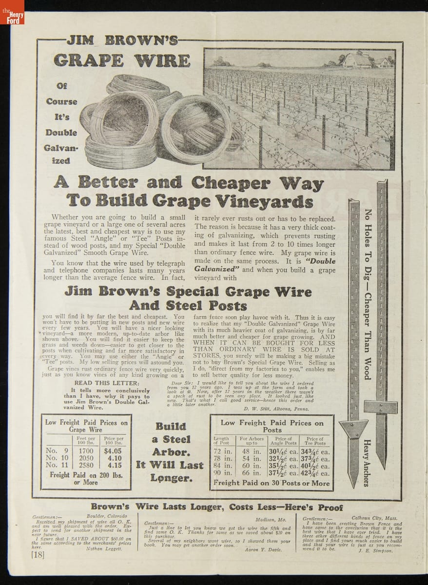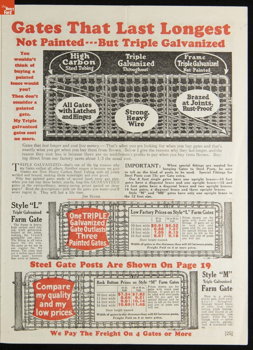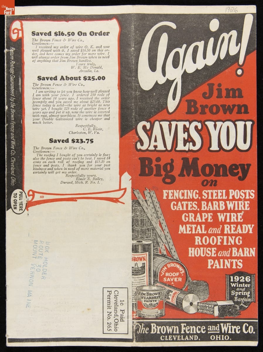 Brown Fence & Wire Co. Trade Catalog, "Again! Jim Brown Saves You Big Money on Fencing, Steel Posts, Gates, Barb Wire, Grape Wire, Metal and Ready Roofing, House and Barn Paints," 1926