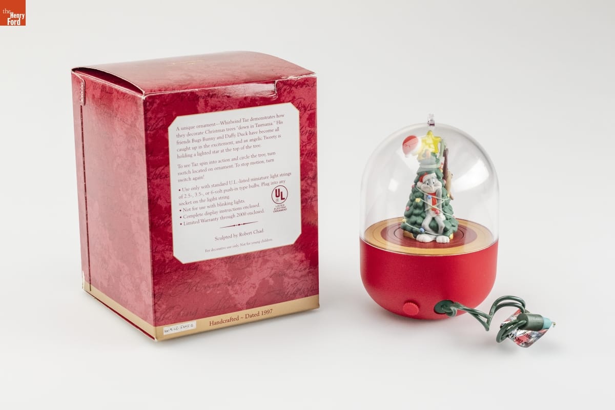 A unique ornament -- Whirlwind Taz demonstrates how / they decorate Christmas trees "down in Tasmania." His / friends Bugs Bunny and Daffy Duck have become all / caught up in the excitement, and an angelic Tweety is / holding a lighted star at the top of the tree. / To see Taz spin into action and circle the tree, turn / switch located on ornament. To stop motion, turn / switch again! / Use only with standard U.L.- listed miniature light strings / of 2.5-, 3.5-, or 6- volt push-in type bulbs. Plug into any / socket on the light string. / Not for use with blinking lights. / Complete display instructions enclosed. / Limited Warranty through 2000 enclosed. / Sculpted by Robert Chad / For decorative use only. Not for young children. / Handcrafted - Dated 1997