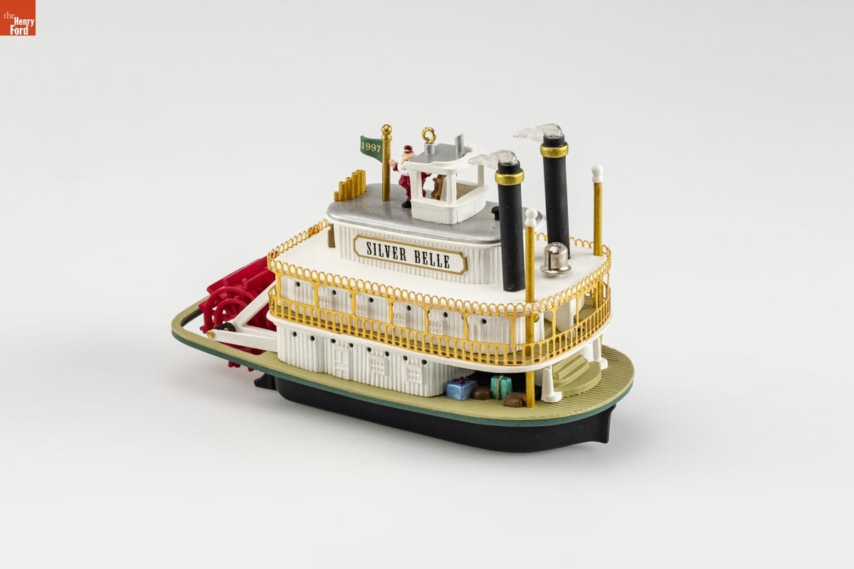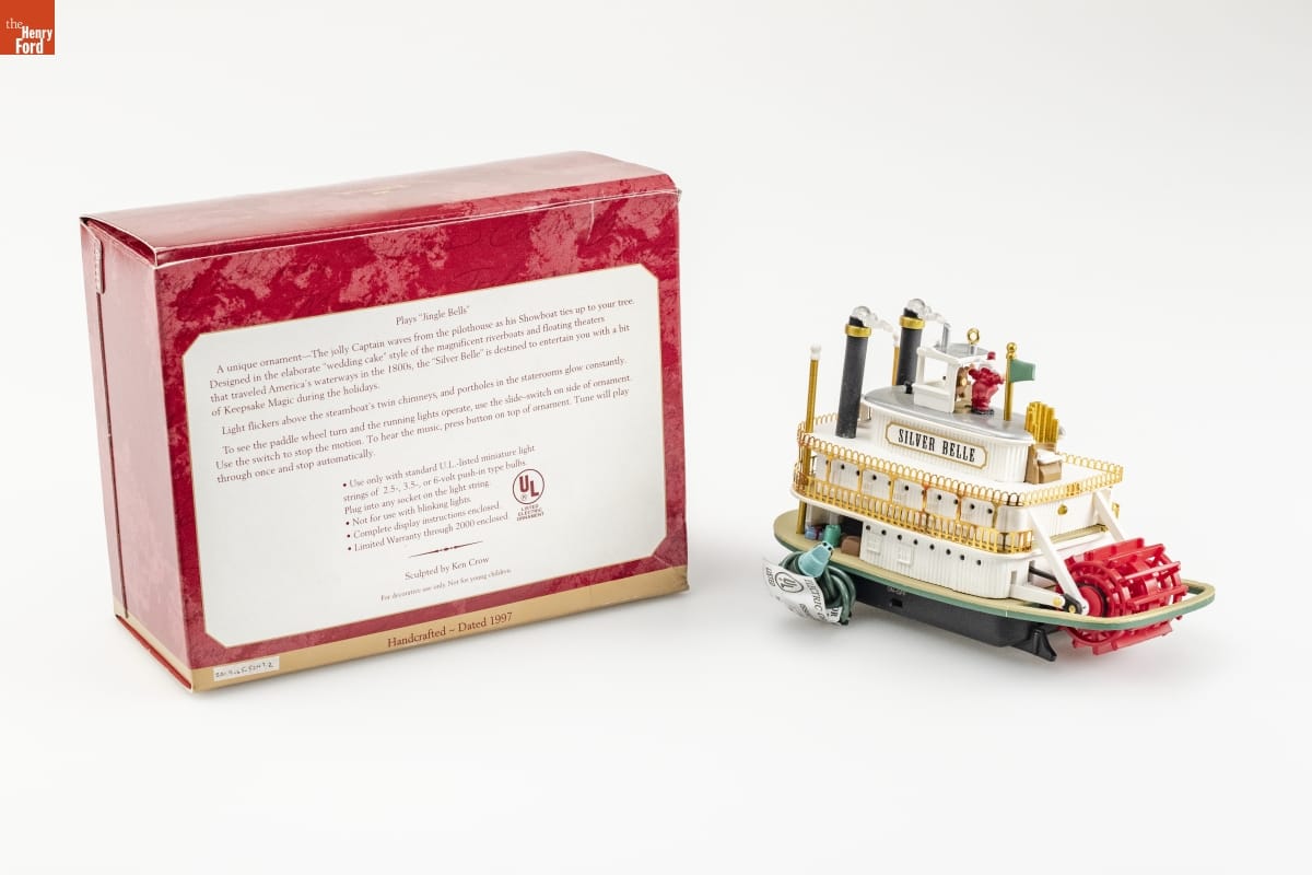 Plays "Jingle Bells" / A unique ornament -- The jolly Captain waves from the pilothouse as his Showboat ties up to your tree. / Designed in the elaborate "wedding cake" style of the magnificent riverboats and floating theaters / that traveled America's waterways in the 1800s, the "Silver Belle" is destined to entertain you with a bit / of Keepsake Magic during the holidays. / Light flickers above the steamboat's twin chimneys, and portholes in the staterooms glow constantly. / To see the paddle wheel turn and the running lights operate, use the slide-switch on side of ornament. / Use the switch to stop the motion. To hear the music, press button on top of ornament. Tune will play / through once and stop automatically. / Use only with standard U.L.- listed miniature light / strings of 2.5-, 3.5-, or 6- volt push-in type bulbs. / Plug into any socket on the light string. / Not for use with blinking lights. / Complete display instructions enclosed. / Limited Warranty through 2000 enclosed. / Sculpted by Ken Crow / For decorative use only / Handcrafted - Dated 1997