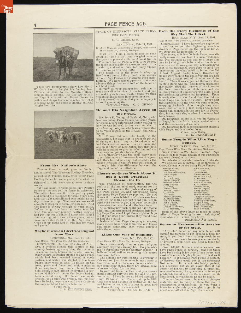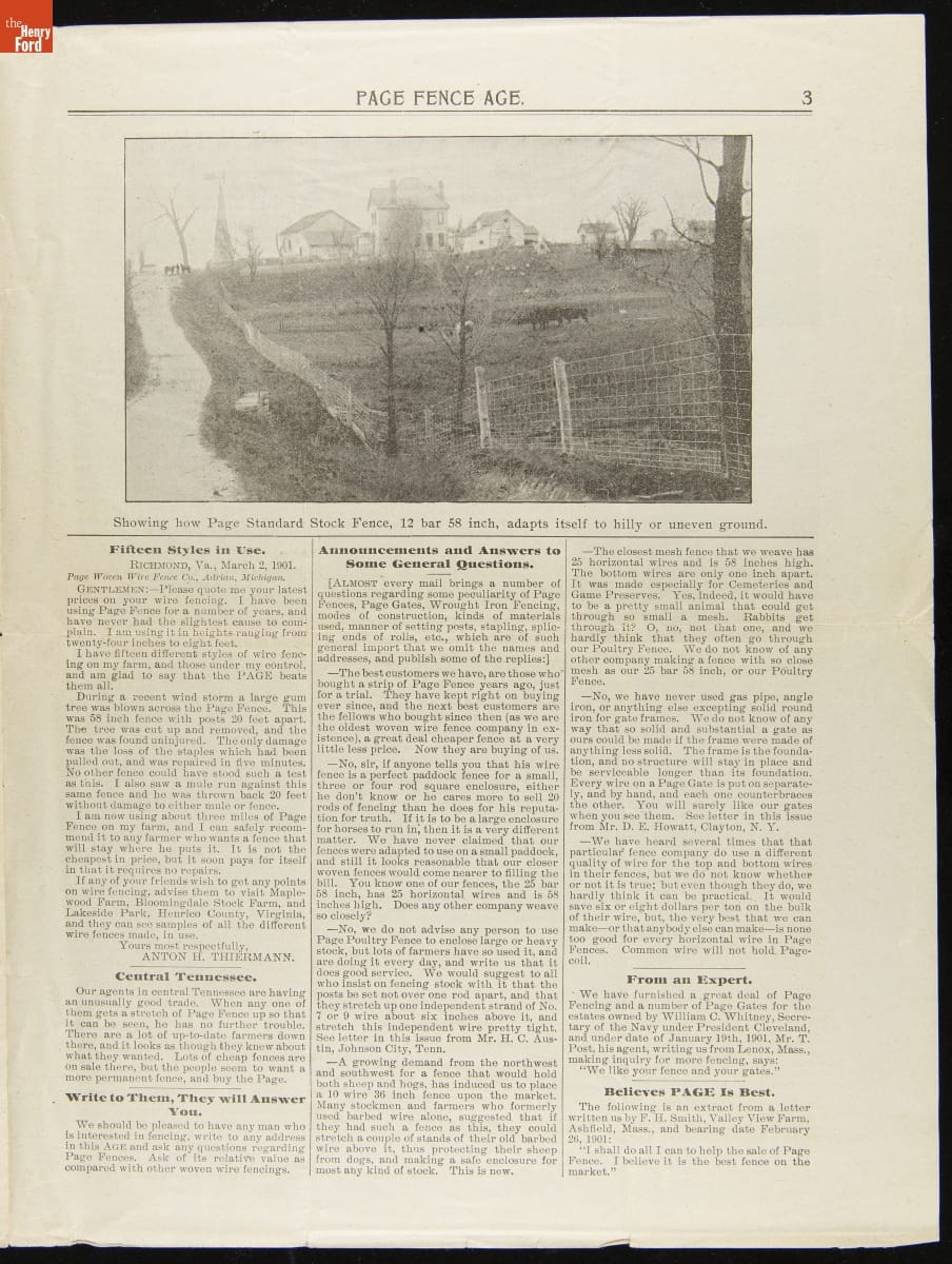 Page Woven Wire Fence Co. Trade Catalog, "Page Fence Age, Volume XI, No. 1," April 1901