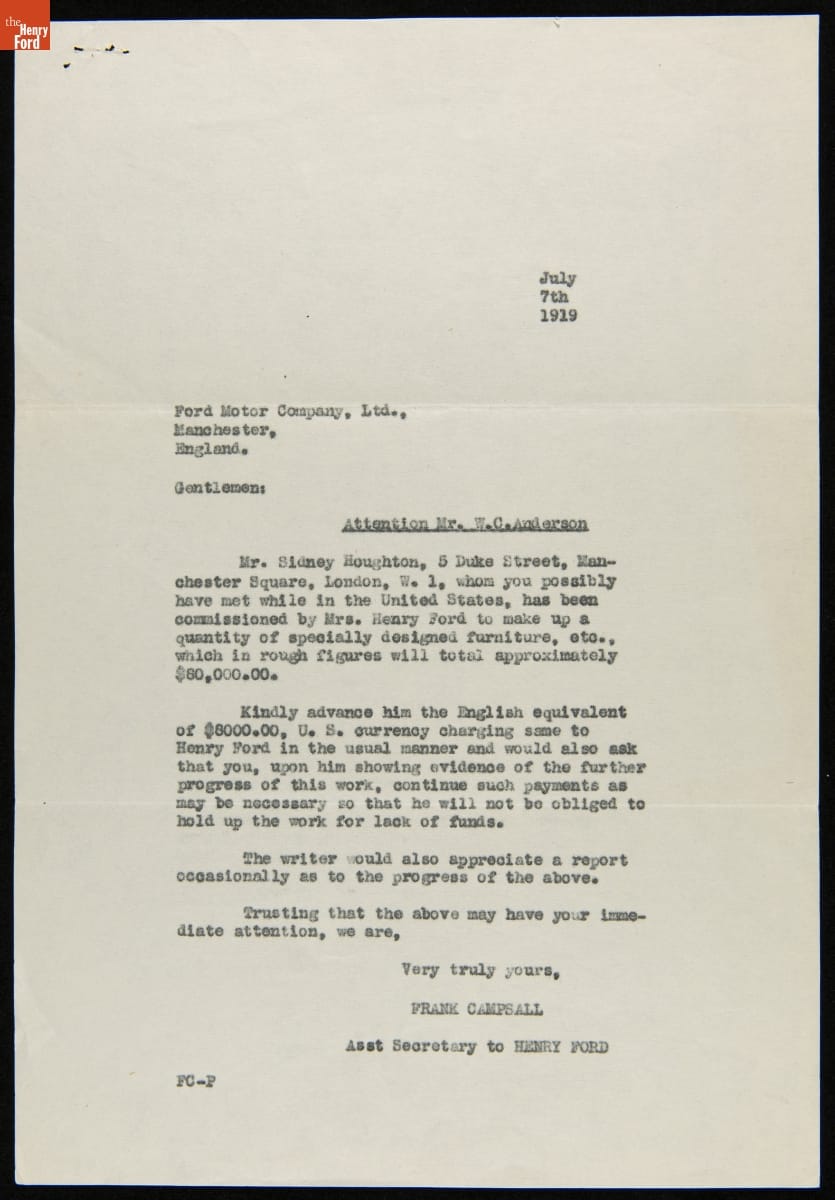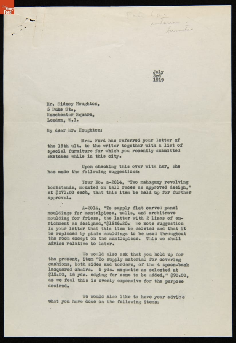 Sidney Houghton, a London-based interior designer, met Henry Ford during World War I. Houghton worked on Ford's "Eagle Boats," supplied to the U.S. and British Navies. Following the War, Henry and Clara Ford commissioned Houghton to create a variety of interiors for their home and other projects. This letter references work proposed for Fair Lane, the Fords' home in Dearborn, Michigan.