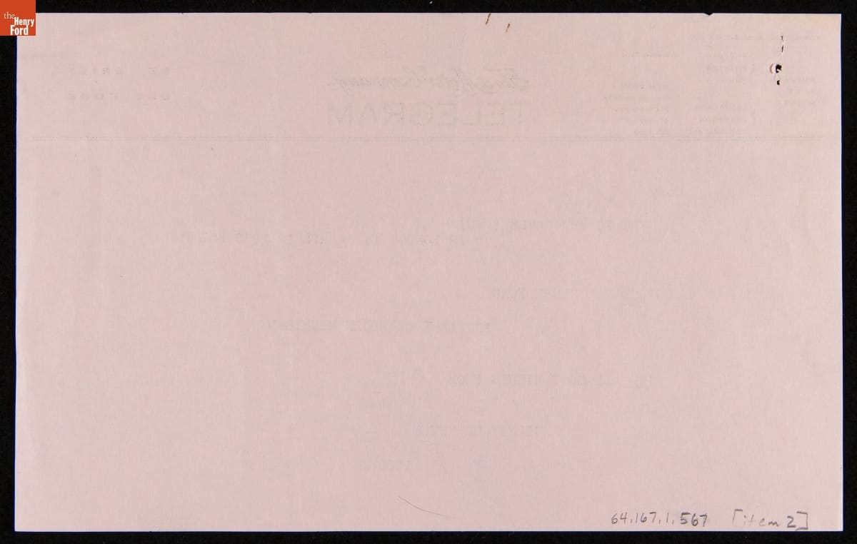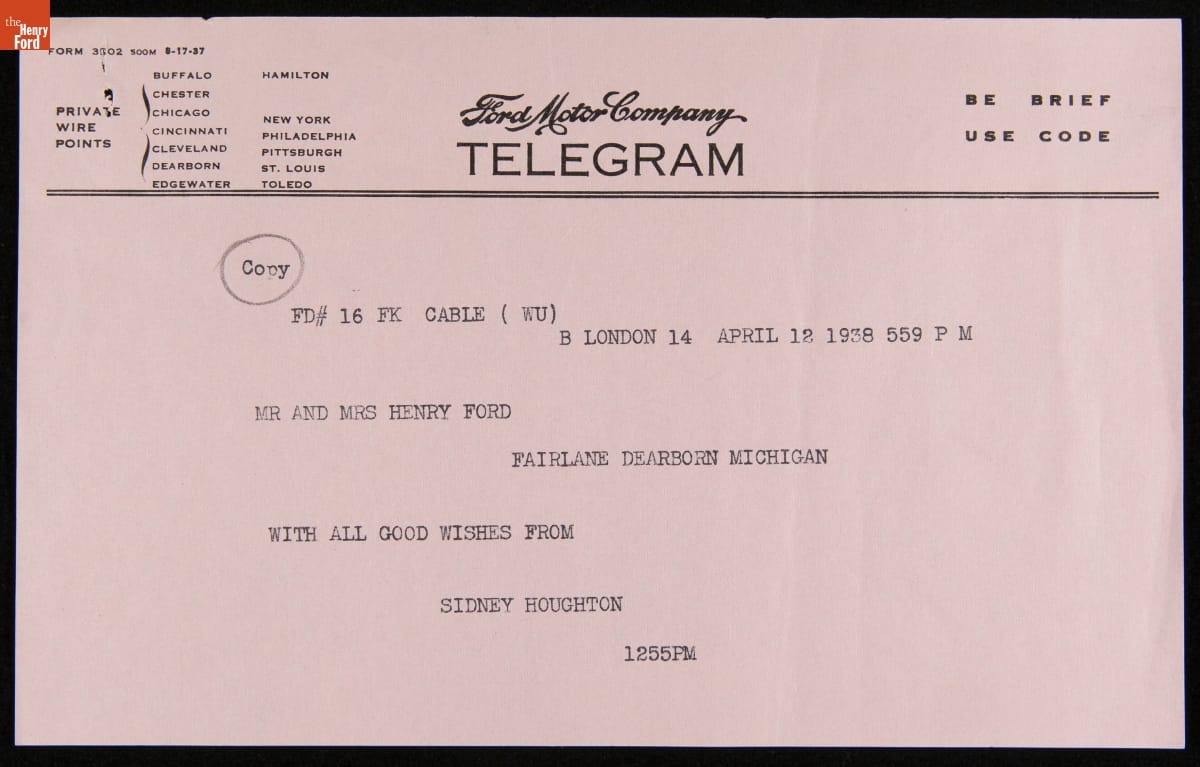Telegram from Sidney Houghton Sending Anniversary Well-wishes to Clara and Henry Ford, April 12, 1838