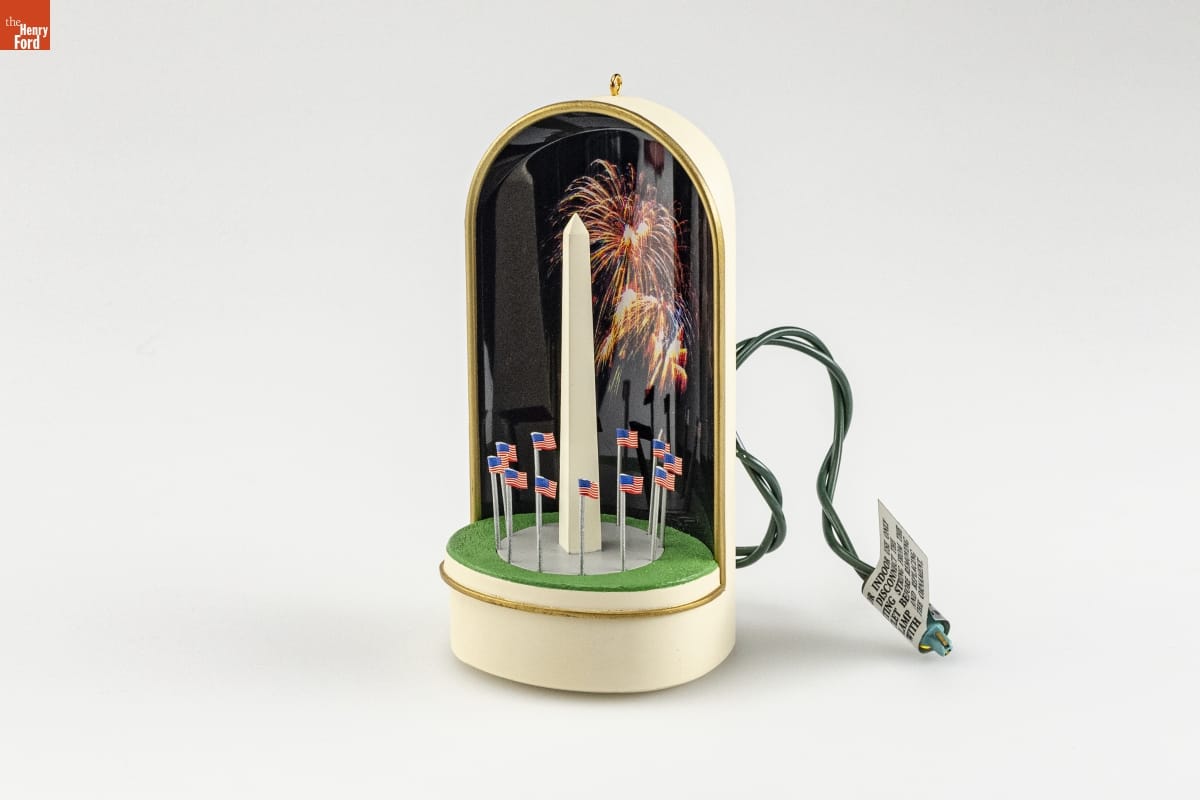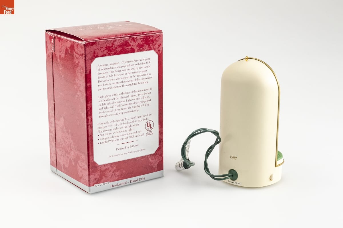 A unique ornament -- Celebrates America's spirit / of independence and pays tribute to the first U.S. / President. This design was inspired by spectacular / Fourth of July fireworks in the nation's capitol. / Fireworks were also featured at the monument at / two historic events -- the placing of the cornerstone / and the dedication of the completed landmark. / Light glows softly at the base of the monument. To / see (and hear!) the "fireworks show," press button / on left side of ornament. Light on base will dim, / and lights will "flash" across the sky, accompanied / by the sound of real fireworks. Display will play / through once and stop automatically. / Use only with standard U.L.- listed miniature light / strings of 2.5-, 3.5-, or 6- volt push-in type bulbs. / Plug into any socket on the light string. / Not for use with blinking lights. / Complete display instructions enclosed. / Limited Warranty through 2001 enclosed. / Sculpted by Ed Seale / For decorative use only. Not for young children. / Handcrafted - Dated 1998