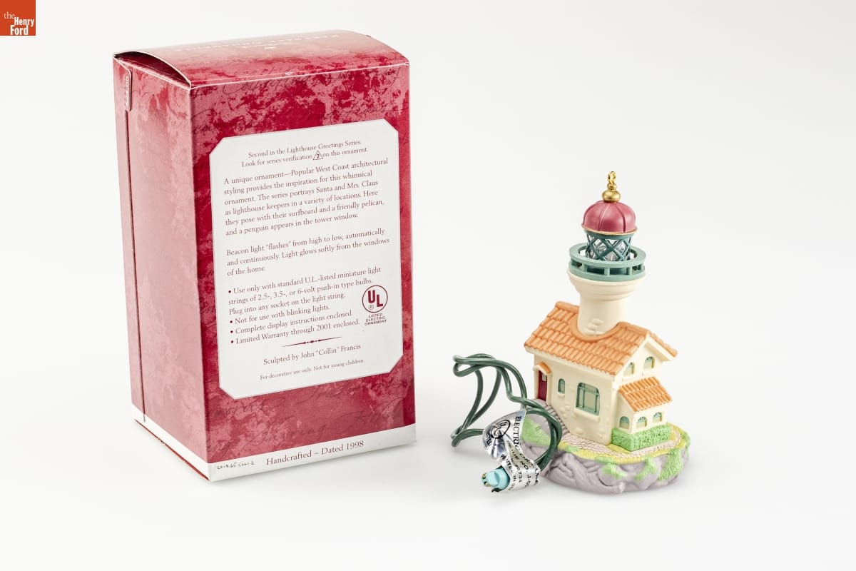 Second in the Lighthouse Greetings Series. / Look for series verification 2 on this ornament. / A unique ornament -- Popular West Coast architectural / styling provides the inspiration for this whimsical / ornament. The series portrays Santa and Mrs. Claus / as lighthouse keepers in a variety of locations. Here / they pose with their surfboard and a friendly pelican, / and a penguin appears in a tower window. / Beacon light "flashes" from high to low, automatically / and continuously. Light glows softly from the windows / of the home. / Use only with standard U.L.- listed miniature light / strings of 2.5-, 3.5-, or 6- volt push-in type bulbs. / Plug into any socket on the light string. / Not for use with blinking lights. / Complete display instructions enclosed. / Limited Warranty through 2001 enclosed. / Sculpted by John "Collin" Francis / For decorative use only. Not for young children. / Handcrafted - Dated 1998