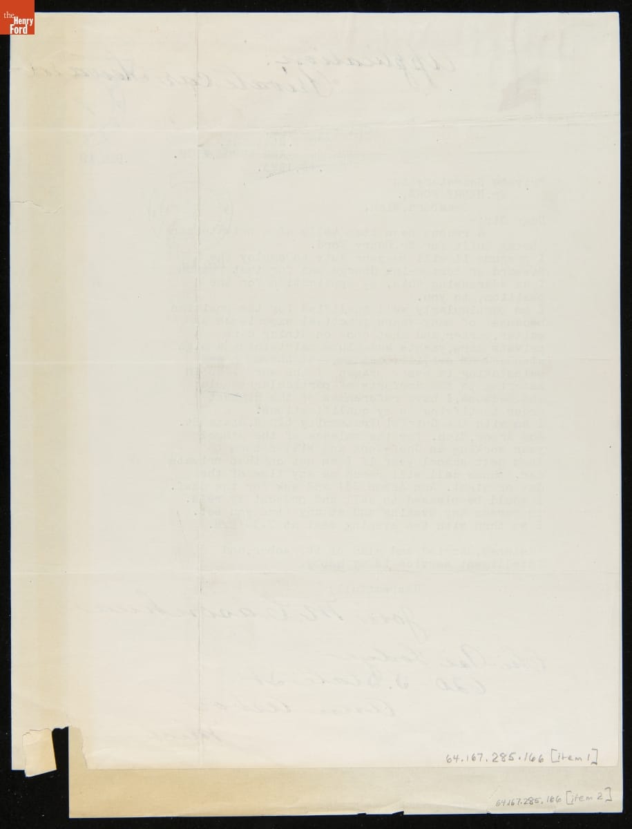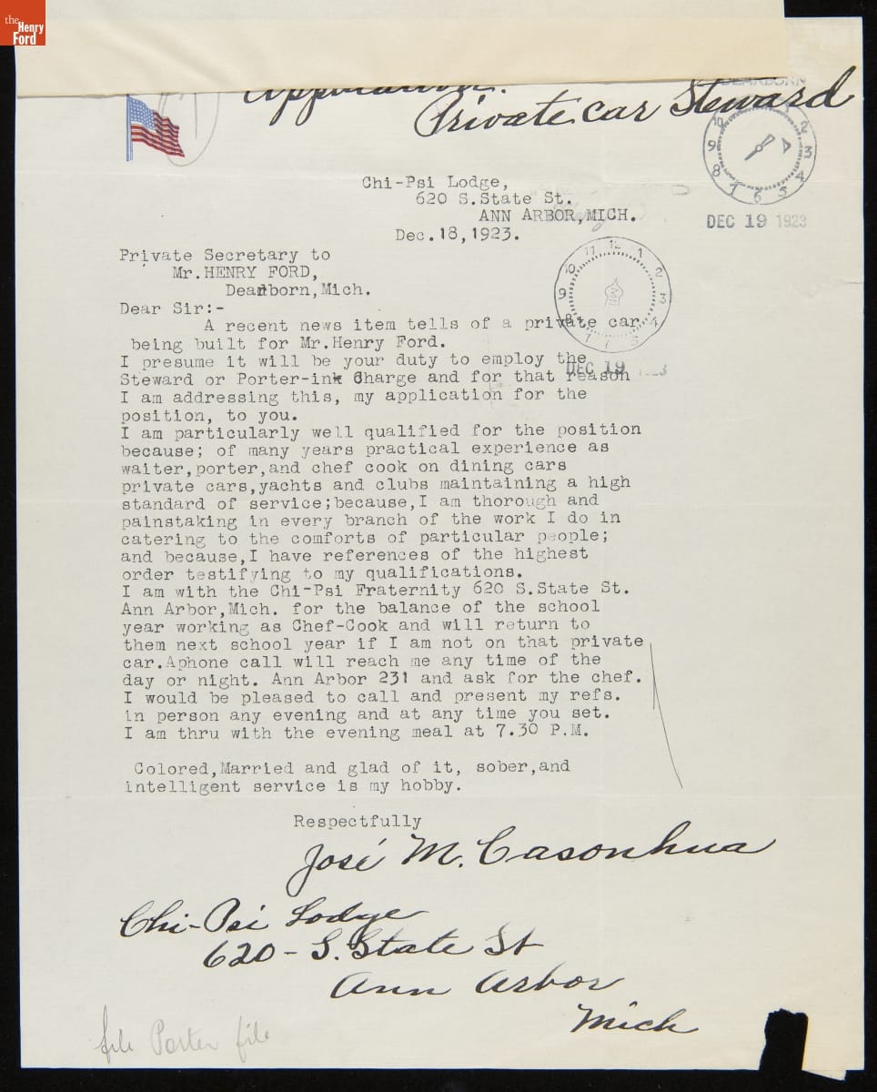 Application Letter from Jose M. Casonhua for Employment on the Fair Lane, Henry Ford's Private Rail Car, December 1923