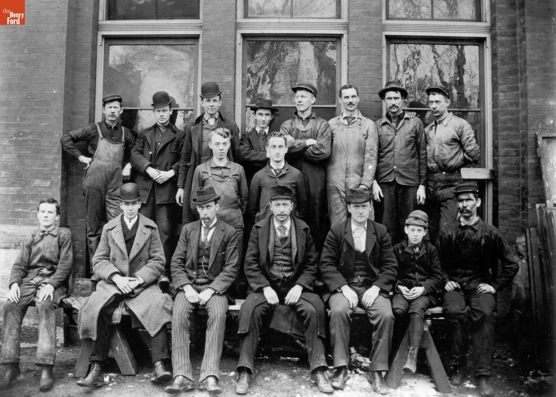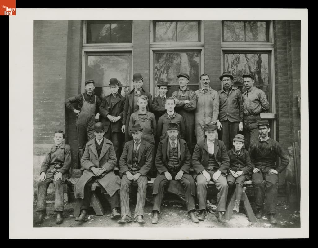 This photograph shows Henry Ford, third from the right in the top row, with a mustache and coveralls. By early 1894, Ford would be promoted to chief engineer at the Edison Illuminating Company in Detroit. Some of his coworkers -- including George Cato and Jim Bishop, pictured here -- helped Henry build his first horseless carriage, the Quadricycle.