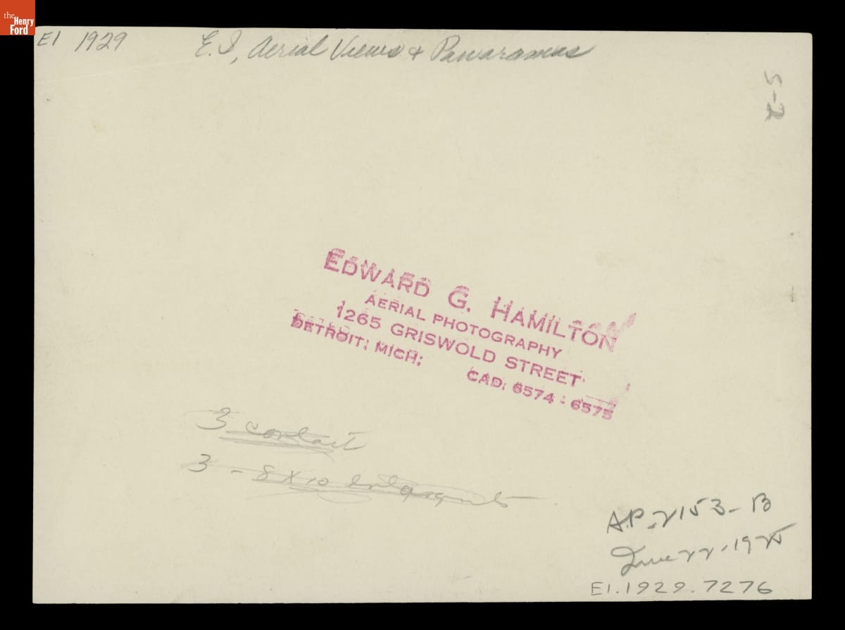 Planes, pilots, and cameras that had been used for aerial reconnaissance during World War I found new work conducting aerial surveys in the 1920s. Aerial survey images helped inform changing agricultural practices, urban planning, and real estate development. This photograph, taken by a Detroit-based aerial surveyor, shows Dearborn, Michigan, where auto magnate Henry Ford completed many large-scale construction projects.