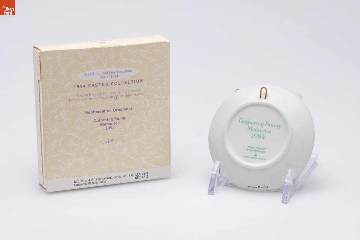Hand-Painted Fine Porcelain / Dated 1994 / 1994 EASTER COLLECTION / First in the new Collector's Plate Series. / Look for series verification 1 on this ornament. / Sentiment on Ornament: / Gathering Sunny / Memories / 1994 / Mfd. for and (C) 1993 Hallmark Cards, Inc., K.C., MO 64141 / Ornament Made in China QEO823-3
