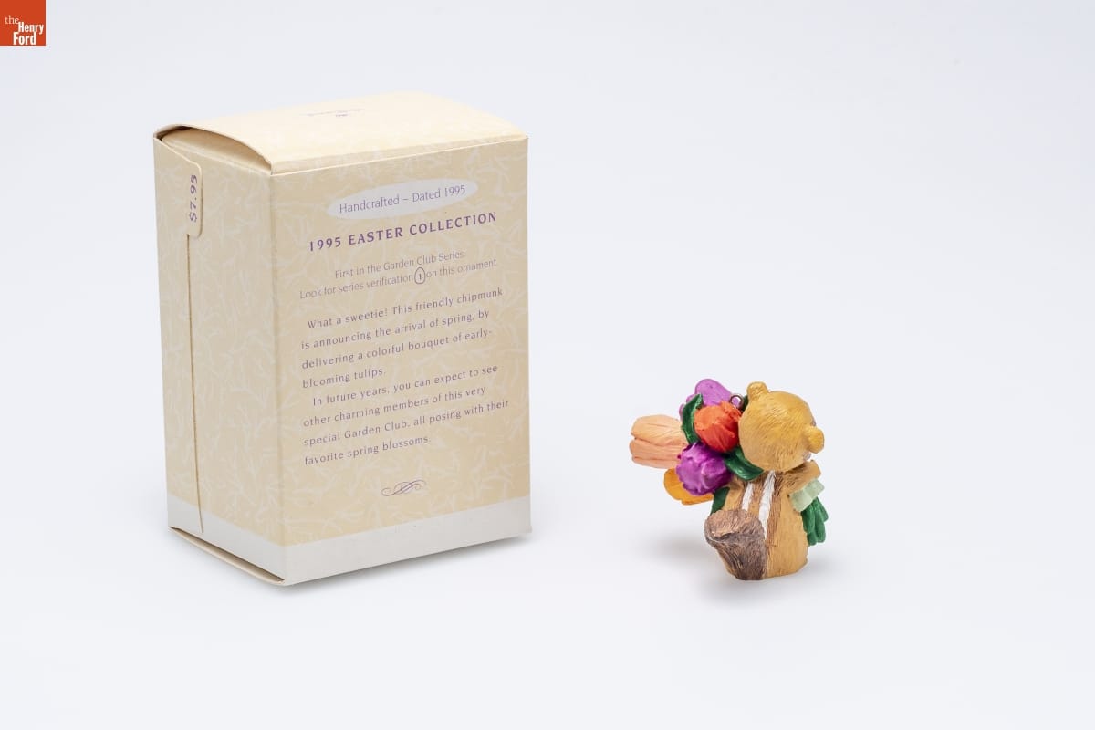 Handcrafted - Dated 1995 / 1995 EASTER COLLECTION / First in the Garden Club Series. / Look for series verification 1 on this ornament. / What a sweetie! This friendly chipmunk / is announcing the arrival of spring, by / delivering a colorful bouquet of early- / blooming tulips. / In future years, you can expect to see / other charming members of this very / special Garden Club, all posing with their / favorite spring blossoms.