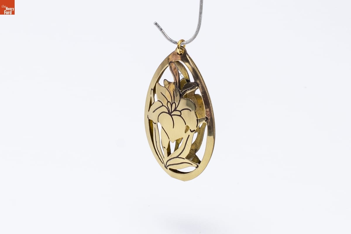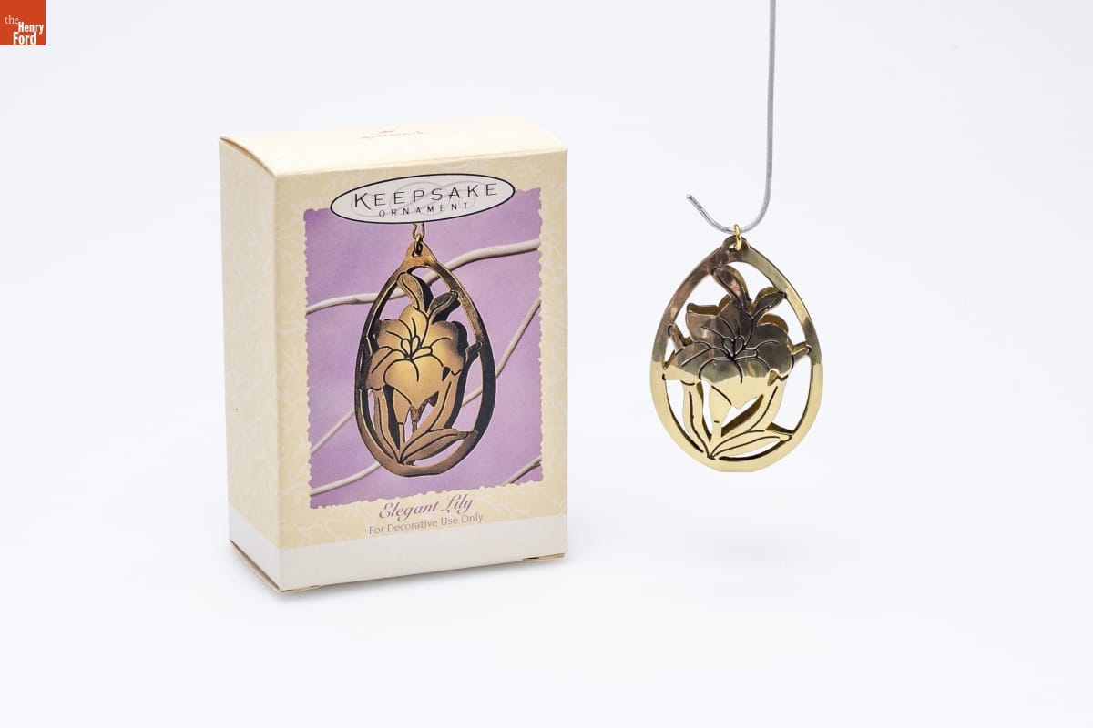 on back of ornament: (C) 1994 Hallmark Cards, Inc. on front of packaging: KEEPSAKE / ORNAMENT / Elegant Lily / For Decorative Use Only on back of packaging: Dimensional Brass / 1995 EASTER COLLECTION / Fashioned from two separate layers of / gleaming brass, this intricately detailed / design combines two favorite symbols of / the Easter season. The delicate lily has / been shaped within the silhouette of an / egg, creating a lovely accent for a tree, / wreath, or gift package. on top of packaging: Hallmark on bottom of packaging: Mfd. for and (C) 1994 Hallmark Cards, Inc., K.C., MO 64141 / Made in China QEO8267