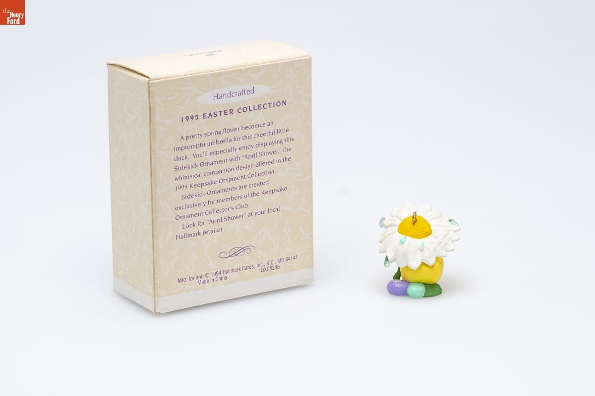 Handcrafted / 1995 EASTER COLLECTION / A pretty spring flower becomes an / impromptu umbrella for this cheerful little / duck. You'll especially enjoy displaying this / Sidekick Ornament with "April Shower," the / whimsical companion design offered in the / 1995 Keepsake Ornament Collection. / Sidekick Ornaments are created / exclusively for members of the Keepsake / Ornament Collector's Club. / Look for "April Shower" at your local / Hallmark retailer. / Mfd. for and (C) 1994 Hallmark Cards, Inc., K.C., MO 64141 / Made in China QXC8246