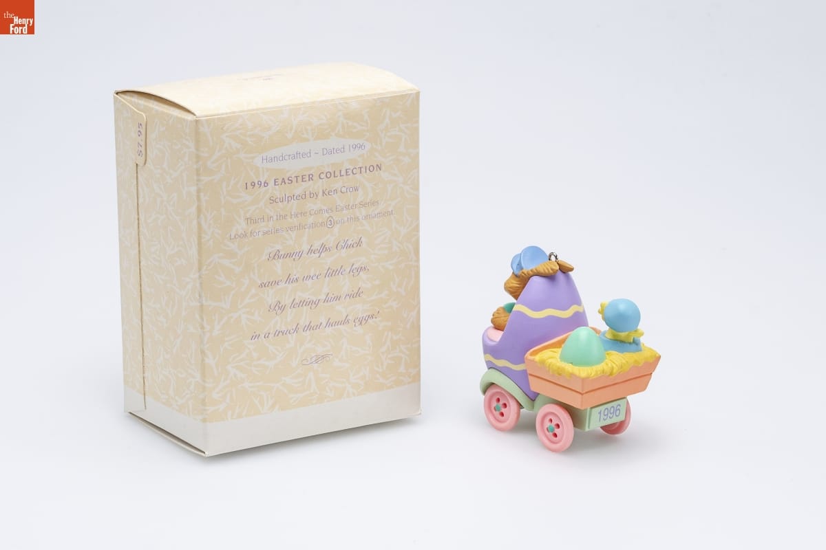 Handcrafted - Dated 1996 / 1996 EASTER COLLECTION / Sculpted by Ken Crow / Third in the Here Comes Easter Series. / Look for series verification 3 on this ornament. / Bunny helps Chick / save his wee little legs, / By letting him ride / in a truck that hauls eggs!