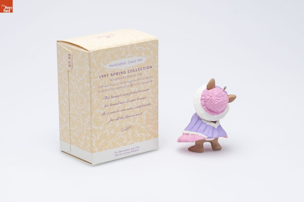 Handcrafted - Dated 1997 / 1997 SPRING COLLECTION / Sculpted by Sharon Pike / Fifth and Final in the Springtime Bonnet Series. / Look for series verification 5 on this ornament. / This bunny's very proud to wear / her brand-new Easter bonnet-- / She's sure to win some compliments / for all the flowers on it! / For decorative use only. / Not for young children.
