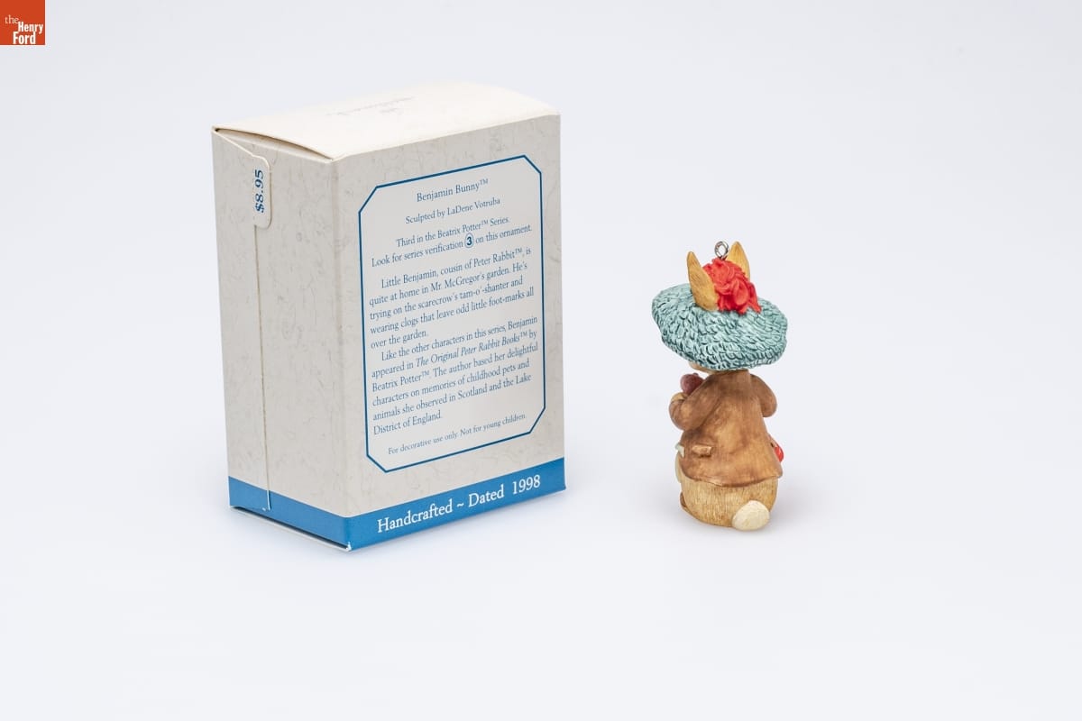 Benjamin Bunny TM / Sculpted by LaDene Votruba / Third in the Beatrix Potter TM Series. / Look for series verification 3 on this ornament. / Little Benjamin, cousin of Peter Rabbit TM, is / quite at home in Mr. McGregor's garden. He's / trying on the scarecrow's tam-o'-shanter and / wearing clogs that leave odd little foot-marks all / over the garden. / Like the other characters in this series, Benjamin / appeared in The Original Peter Rabbit Books TM by / Beatrix Potter TM. The author based her delightful / characters on memories of childhood pets and / animals she observed in Scotland and the Lake / District of England. / For decorative use only. Not for young children. / Handcrafted - Dated 1998