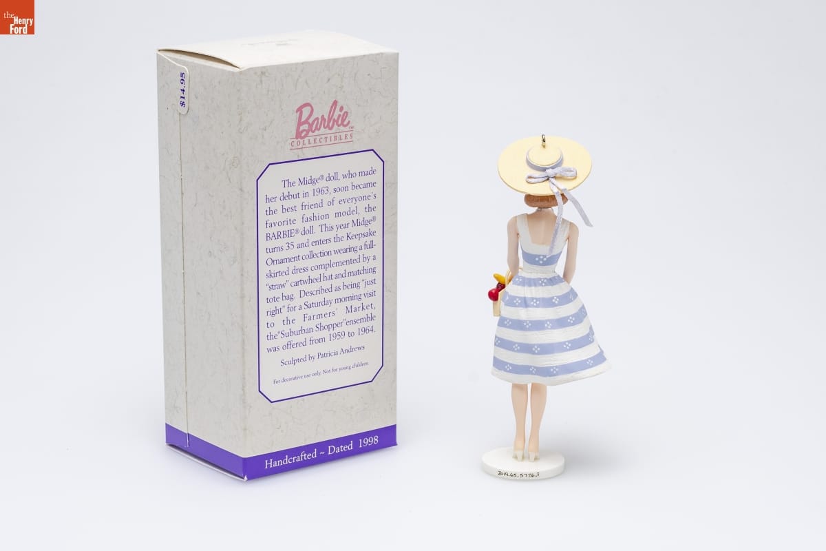 Barbie TM / COLLECTIBLES / The Midge(R) doll, who made / her debut in 1963, soon became / the best friend of everyone's / favorite fashion model, the / BARBIE(R) doll. This year Midge(R) turns 35 and enters the Keepsake / Ornament collection wearing a full- / skirted dress complemented by a / "straw" cartwheel hat and matching / tote bag. Described as being "just / right" for a Saturday morning visit / to the Farmers' Market, / the "Suburban Shopper" ensemble / was offered from 1959 to 1964. / Sculpted by Patricia Andrews / For decorative use only. / Not for young children. / Handcrafted - Dated 1998