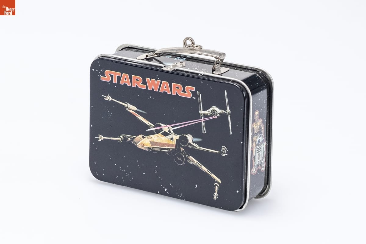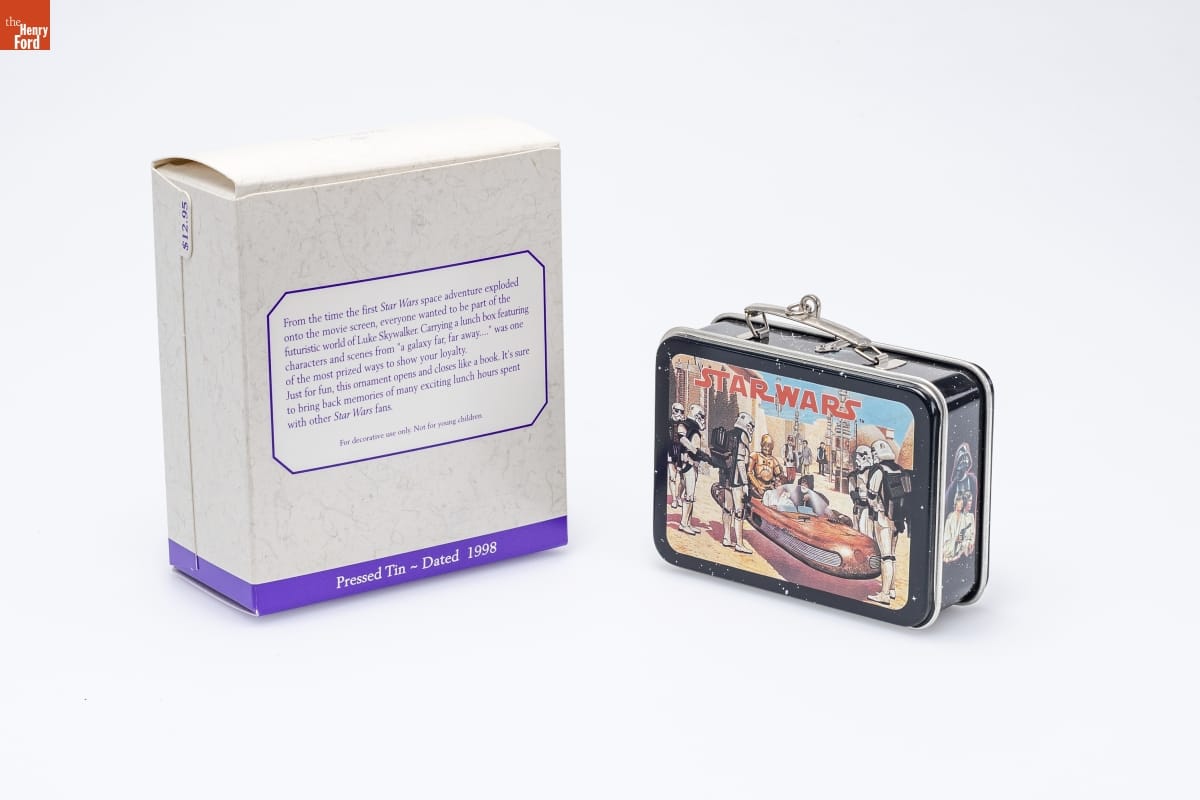 From the time the first Star Wars space adventure exploded / onto the movie screen, everyone wanted to be part of the / futuristic world of Luke Skywalker. Carrying a lunch box featuring / characters and scenes from "a galaxy far, far away...." was one / of the most prized ways to show your loyalty. / Just for fun, this ornament opens and closes like a book. It's sure / to bring back memories of many exciting lunch hours spent / with other Star Wars fans. / For decorative use only. Not for young children. / Pressed Tin - Dated 1998