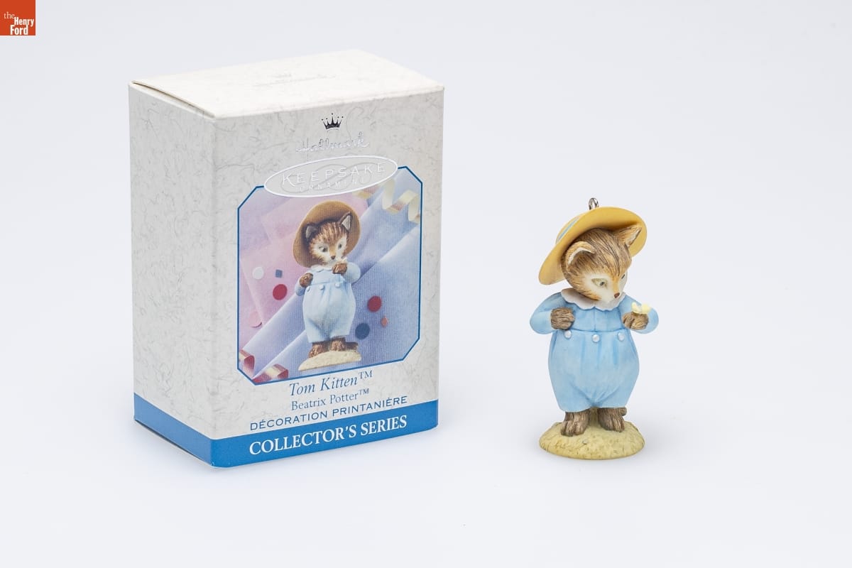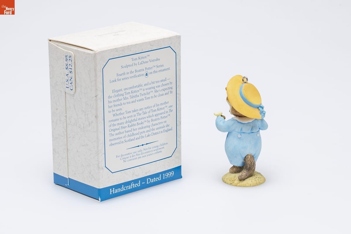 Tom Kitten TM / Sculpted by LaDene Votruba / Fourth in the Beatrix Potter TM Series. / Look for series verification 4 on this ornament. / Elegant, uncomfortable, and a bit too small --- / the clothing Tom Kitten TM is wearing was chosen by / his mother Mrs. Tabitha Twitchit TM. She's expecting / her friends to tea and wants Tom to be clean and 'fit / to be seen.' / Whether Tom takes any notice of his mother / remains to be seen in The Tale of Tom Kitten TM, one / of the many delightful stories which appeared in The / Original Peter Rabbit Books TM by Beatrix Potter TM. / The author based her endearing characters on / memories of childhood pets and the animals she / observed in Scotland and the Lake District in England. / For decorative use only. Not for young children. / Concue a des fins decoratives seulement. / Ne convient pas aux jeunes enfants. / Handcrafted - Dated 1999