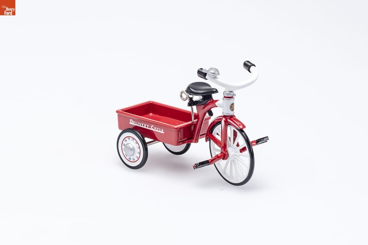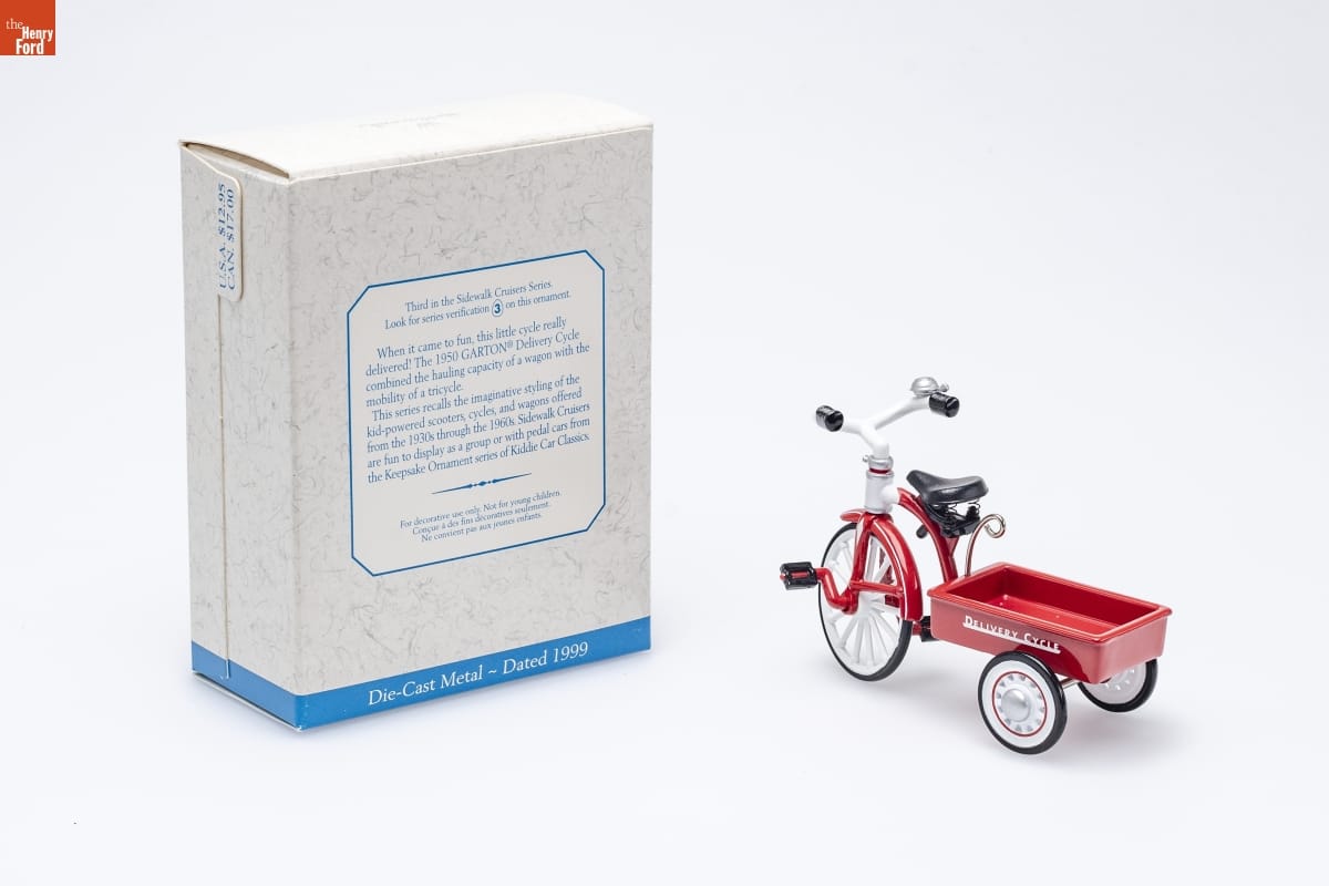 Third in the Sidewalk Cruisers Series. / Look for series verification 3 on this ornament. / When it came to fun, this little cycle really / delivered! The 1950 GARTON(R) Delivery Cycle / combined the hauling capacity of a wagon with the mobility of a tricycle. / This series recalls the imaginative styling of the / kid-powered scooters, cycles, and wagons offered / from the 1930s through the 1960s. Sidewalk Cruisers / are fun to display as a group or with pedal cars from / the Keepsake Ornament series of Kiddie Car Classics. / For decorative use only. Not for young children. / Concue a des fins decoratives seulement. / Ne convient pas aux jeunes enfants. / Die-Cast Metal - Dated 1999