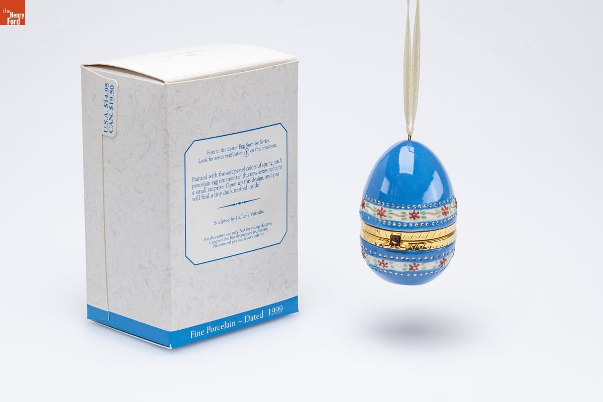 First in the Easter Egg Surprise Series. / Look for series verification 1 on this ornament. / Painted with the soft pastel colors of spring, each / porcelain egg ornament in this new series contains / a small surprise. Open up this design, and you / will find a tiny duck nestled inside. / Sculpted by LaDene Votruba / For decorative use only. Not for young children. / Concue a des fins decoratives seulement. / Ne convient pas aux jeunes enfants. / Fine Porcelain - Dated 1999