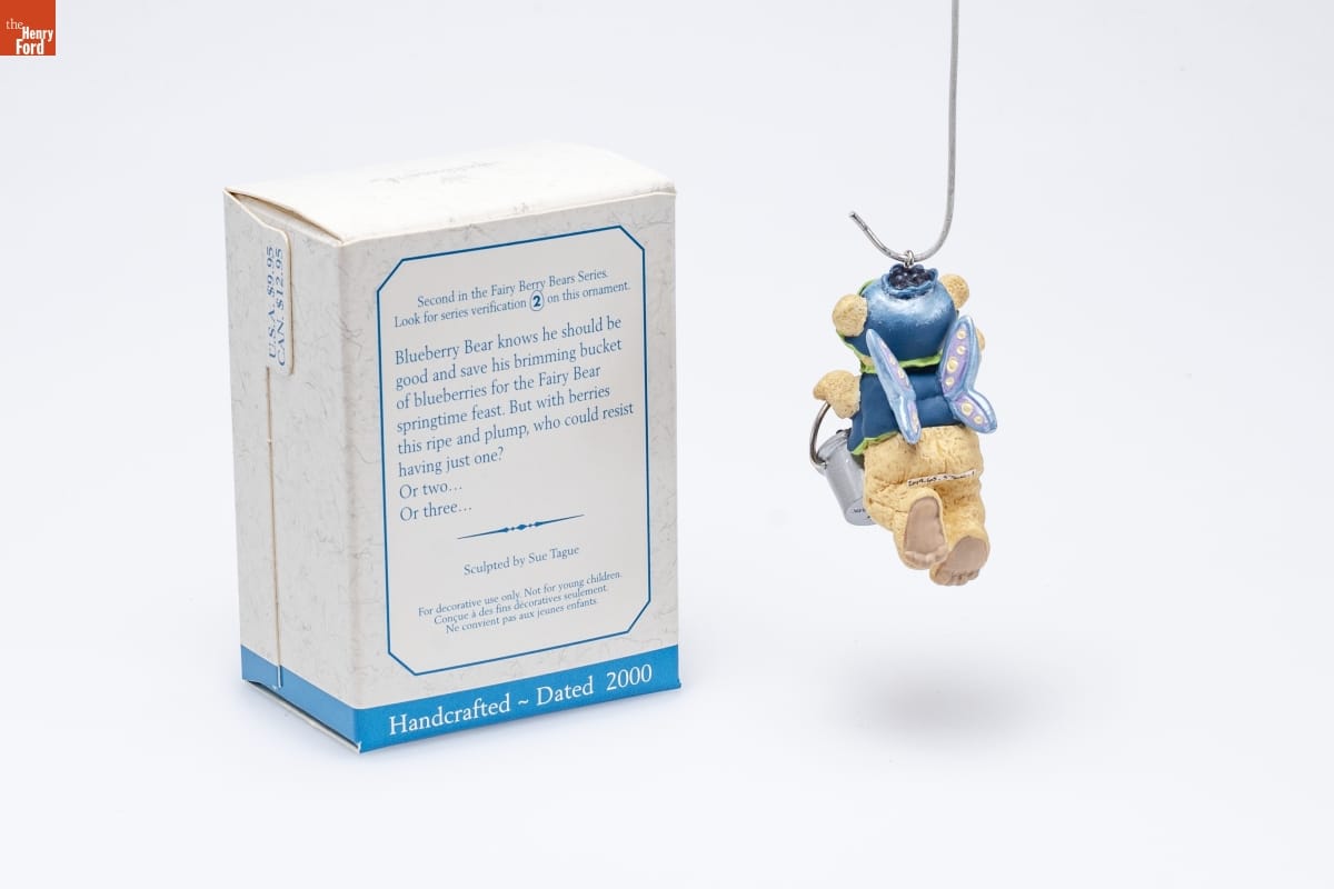 Second in the Fairy Berry Bears Series. / Look for series verification 2 on this ornament. / Blueberry Bear knows he should be / good and save his brimming bucket / of blueberries for the Fairy Bear / springtime feast. But with berries / this ripe and plump, who could resist / having just one? / Or two... / Or three... / Sculpted by Sue Tague / For decorative use only. Not for young children. / Concue a des fins decoratives seulement. / Ne convient pas aux jeunes enfants. / Handcrafted - Dated 2000