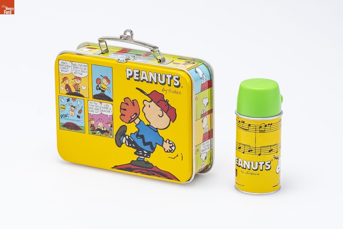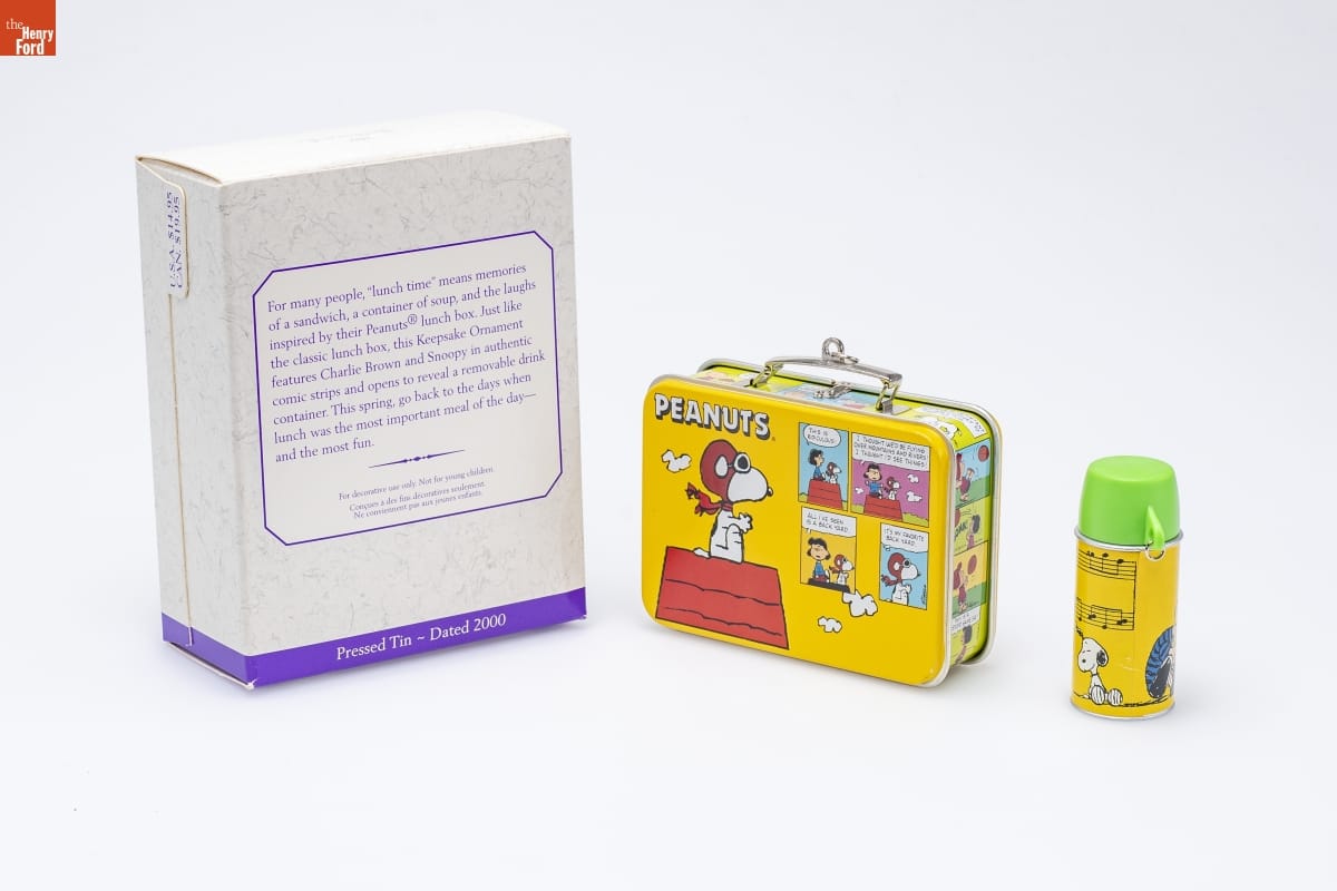 For many people, "lunch time" means memories / of a sandwich, a container of soup, and the laughs / inspired by their PEANUTS(R) lunch box. Just like / the classic lunch box, this Keepsake Ornament / features Charlie Brown and Snoopy in authentic / comic strips and opens to reveal a removable drink / container. This spring, go back to the days when / lunch was the most important meal of the day-- / and the most fun. / For decorative use only. Not for young children. / Concues a des fins decoratives seulement. / Ne conviennent pas aux jeunes enfants. / Pressed Tin - Dated 2000