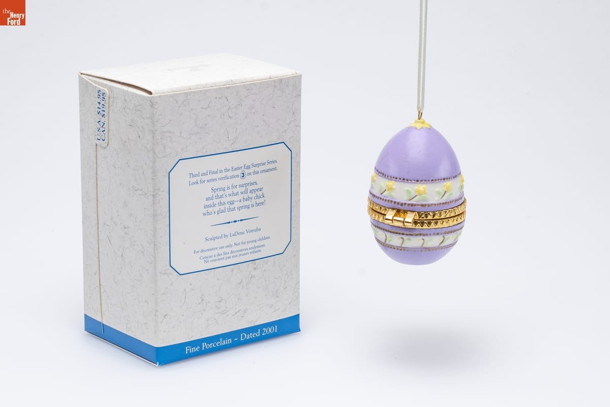 Third and Final in the Easter Egg Surprise Series. / Look for series verification 3 on this ornament. / Spring is for surprises, / and that's what will appear / inside this egg--a baby chick / who's glad that spring is here! / Sculpted by LaDene Votruba / For decorative use only. Not for young children. / Concue a des fins decoratives seulement. / Ne convient pas aux jeunes enfants. / Fine Porcelain - Dated 2001