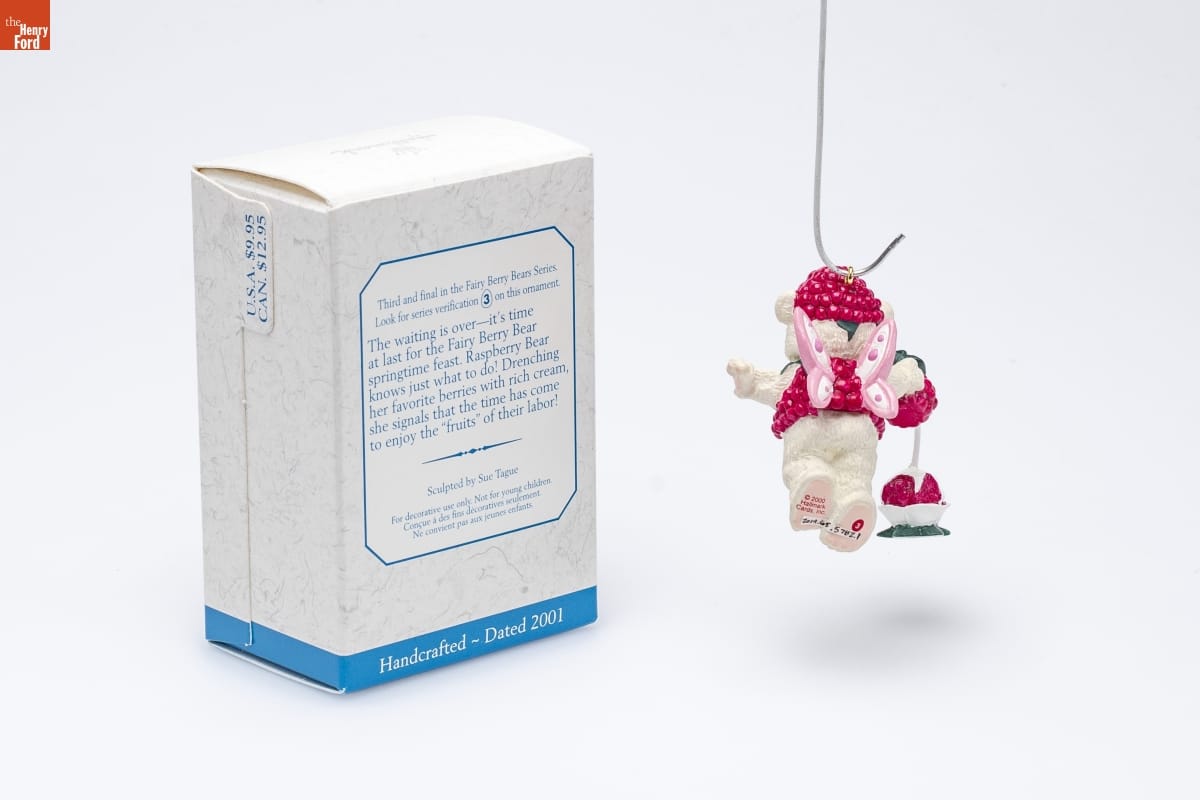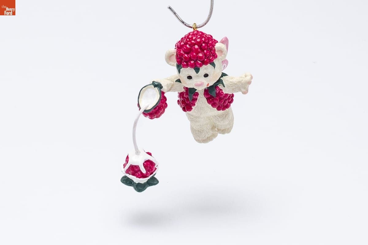 Third and Final in the Fairy Berry Bears Series. / Look for series verification 3 on this ornament. / The waiting is over--it's time / at last for the Fairy Berry Bear / springtime feast. Raspberry Bear / knows just what to do! Drenching / her favorite berries with rich cream, / she signals that the time has come / to enjoy the "fruits" of their labor! / Sculpted by Sue Tague / For decorative use only. Not for young children. / Concue a des fins decoratives seulement. / Ne convient pas aux jeunes enfants. / Handcrafted - Dated 2001