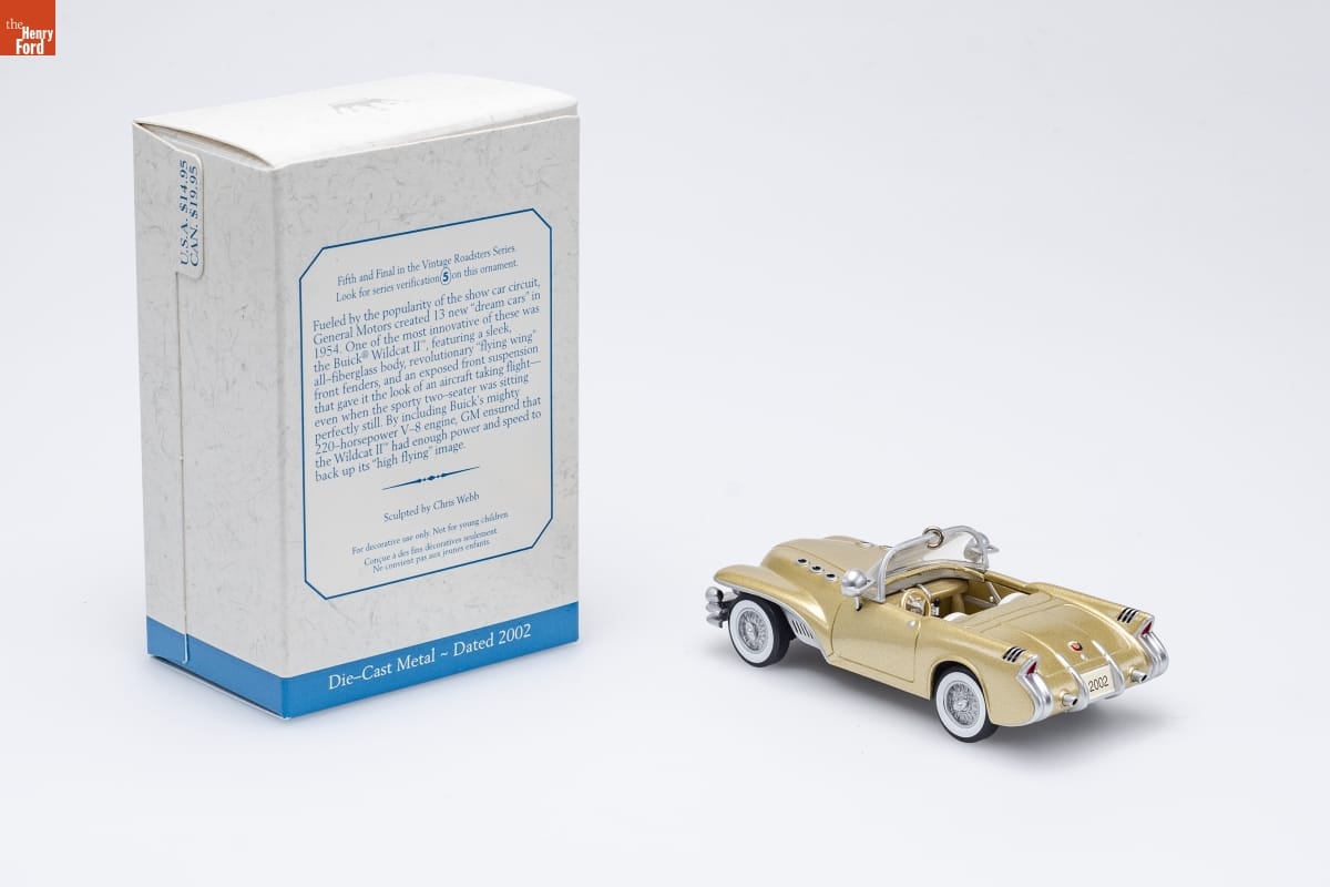 Fifth and Final in the Vintage Roadsters Series. / Look for series verification 5 on this ornament. / Fueled by the popularity of the show car circuit, / General Motors created 13 new "dream cars" in / 1954. One of the most innovative of these was / the Buick(R) Wildcat II TM, featuring a sleek, / all-fiberglass body, revolutionary "flying wing" / front fenders, and an exposed front suspension / that gave it the look of an aircraft taking flight-- / even when the sporty two-seater was sitting / perfectly still. By including Buick's mighty / 220-horsepower V-8 engine, GM ensured that / the Wildcat II TM had enough power and speed to / back up its "high flying" image. / Sculpted by Chris Webb / For decorative use only. Not for young children. / Concue a des fins decoratives seulement. / Ne convient pas aux jeunes enfants. / Die-Cast Metal - Dated 2002