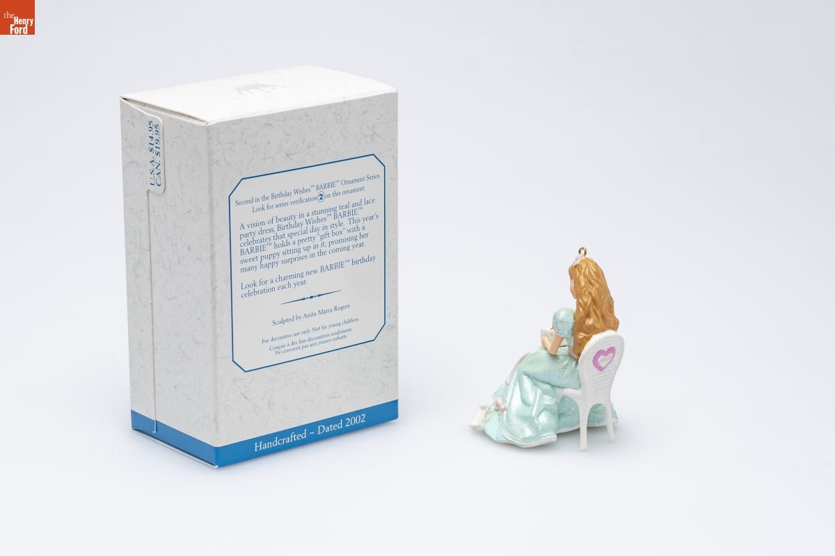 Second in the Birthday Wishes TM BARBIE TM Ornament Series. / Look for series verification 2 on this ornament. / A vision of beauty in a stunning teal and lace / party dress, Birthday Wishes TM BARBIE TM / celebrates that special day in style. This year's / BARBIE TM holds a pretty "gift box" with a / sweet puppy sitting up in it, promising her / many happy surprises in the coming year. / Look for a charming new BARBIE TM brithday / celebration each year. / Sculpted by Anita Marra Rogers / For decorative use only. Not for young children. / Concue a des fins decoratives seulement. / Ne convient pas aux jeunes enfants. / Handcrafted - Dated 2002