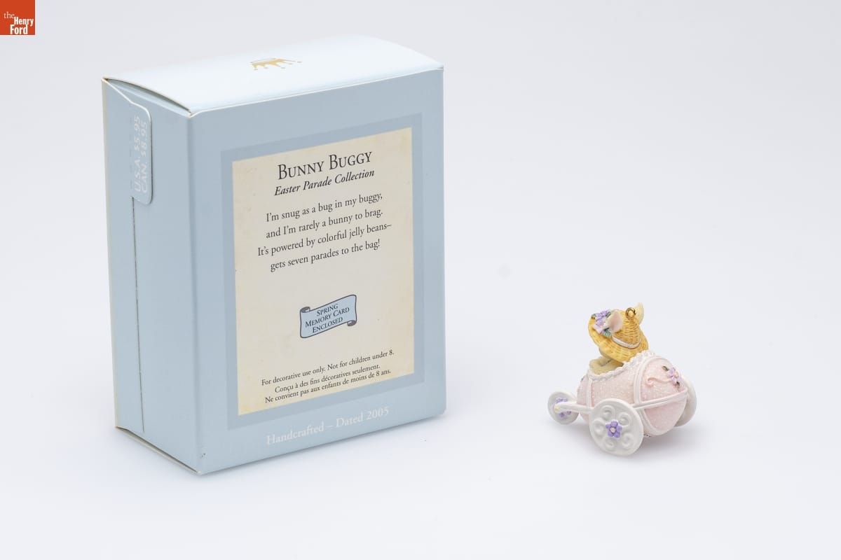 BUNNY BUGGY / Easter Parade Collection / I'm snug as a bug in my buggy, / and I'm rarely a bunny to brag. / It's powered by colorful jelly beans-- / gets seven parades to the bag! / SPRING / MEMORY CARD / ENCLOSED / For decorative use only. Not for children under 8. / Concu a des fins decoratives seulement. / Ne convient pas aux enfants de moins de 8 ans. / Handcrafted - Dated 2005