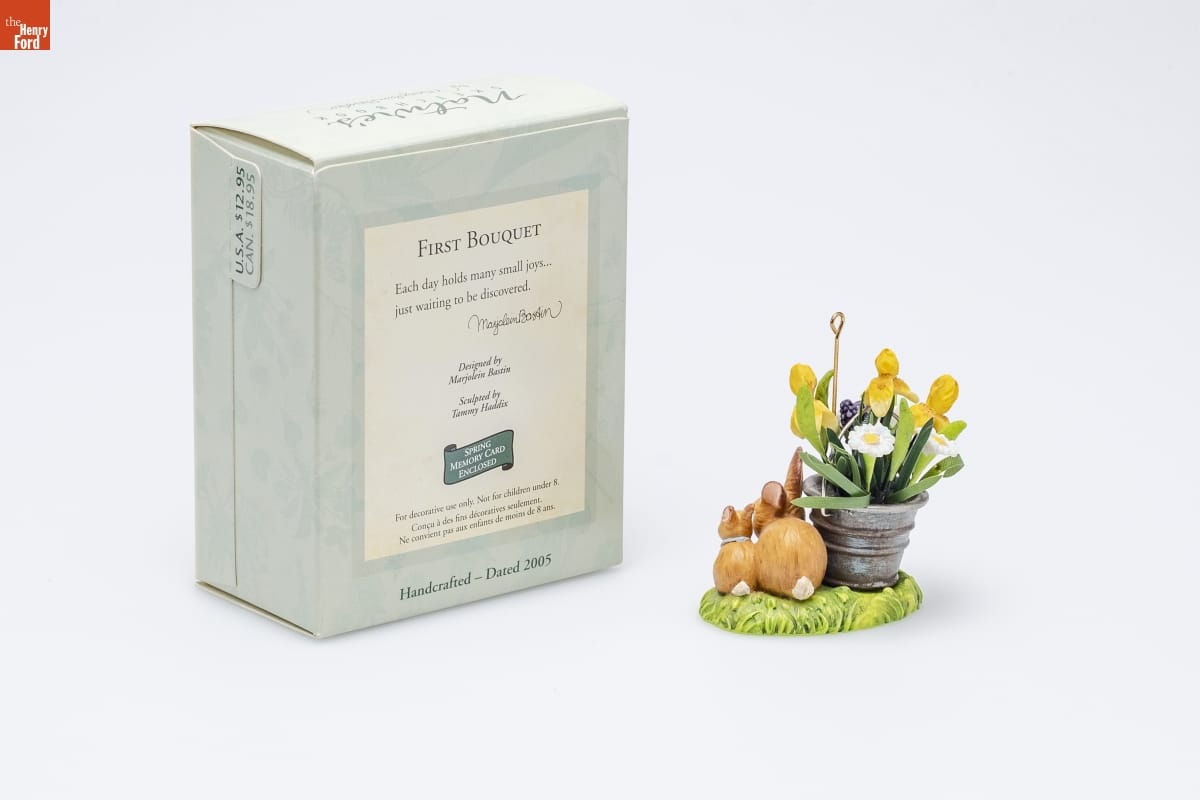 FIRST BOUQUET / Each day holds many small joys... / just waiting to be discovered. / Marjolein Bastin / Designed by Marjolein Bastin / Sculpted by / Tammy Haddix / SPRING / MEMORY CARD / ENCLOSED / For decorative use only. Not for children under 8. / Concu a des fins decoratives seulement. / Ne convient pas aux enfants de moins de 8 ans. / Handcrafted - Dated 2005