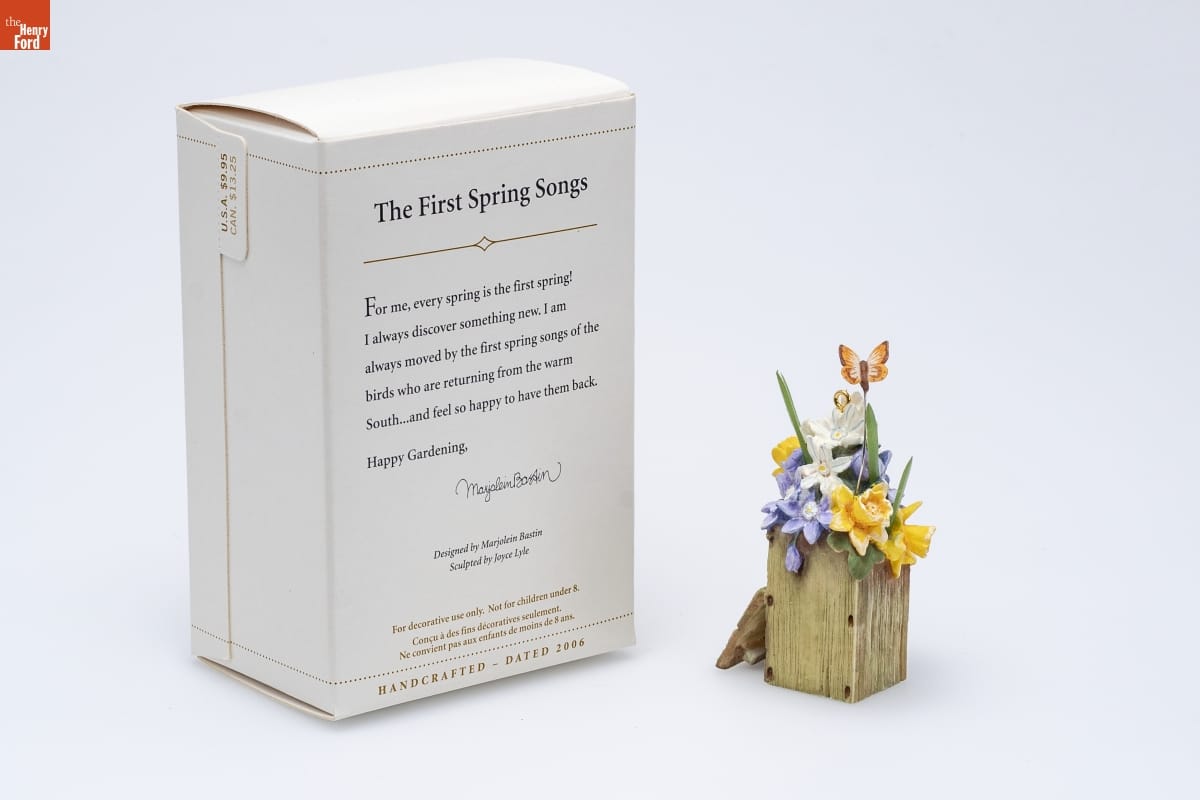The First Spring Songs / For me, every spring is the first spring! / I always discover something new. I am / always moved by the first spring songs of the / birds who are returning from the arm / South...and feel so happy to have them back. / Happy Gardening, / Marjolein Bastin / Designed by Marjolein Bastin / Sculpted by / Joyce Lyle / For decorative use only. Not for children under 8. / Concu a des fins decoratives seulement. / Ne convient pas aux enfants de moins de 8 ans. / HANDCRAFTED - DATED 2006