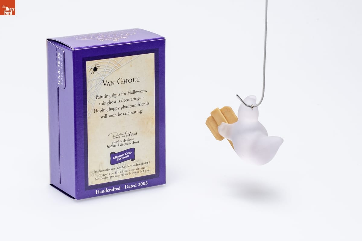 VAN GHOUL / Painting signs for Halloween, / this ghost is decorating-- / Hoping happy phantom friends / will soon be celebrating! / Patricia Andrews / Hallmark Keepsake Artist / MEMORY CARD / ENCLOSED / For decorative use only. Not for children under 8. / Concue a des fins decoratives seulement. / Ne convient pas aux enfants de moins de 8 ans. / Handcrafted - Dated 2003