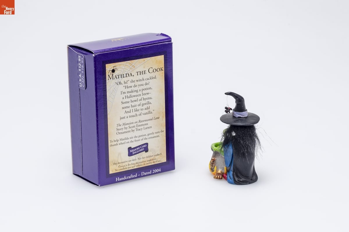MATILDA, THE COOK / "Oh, hi!" the witch cackled. / "How do you do? / I'm making a potion, / a Halloween brew-- / Some howl of hyena, / some hair of gorilla, / And I like to add / just a touch of vanilla." / The Mansion on Ravenwood Lane / Story by Scott Emmons / Ornament by Tracy Larsen / To help Matilda stir the potion, gently turn the / thumb wheel on the front of the ornament. / MEMORY CARD / ENCLOSED / For decorative use only. Not for children under 8. / Concu a des fins decoratives seulement. / Ne convient pas aux enfants de moins de 8 ans. / Handcrafted - Dated 2004