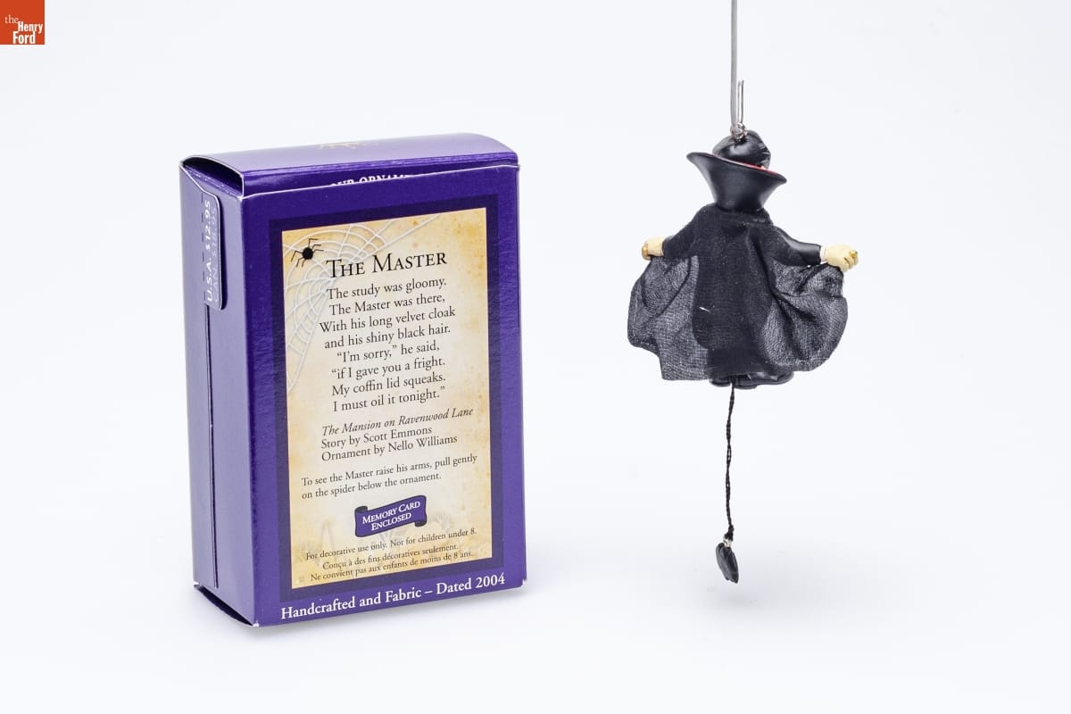 THE MASTER / The study was gloomy. / The Master was there, / With his long velvet cloak / and his shiny black hair. / "I'm sorry," he said, / "if I gave you a fright. / My coffin lid squeaks. / I must oil it tonight." / The Mansion on Ravenwood Lane / Story by Scott Emmons / Ornament by Nello Williams / To see the Master raise his arms, pull gently / on the spider below the ornament. / MEMORY CARD / ENCLOSED / For decorative use only. Not for children under 8. / Concu a des fins decoratives seulement. / Ne convient pas aux enfants de moins de 8 ans. / Handcrafted and Fabric - Dated 2004